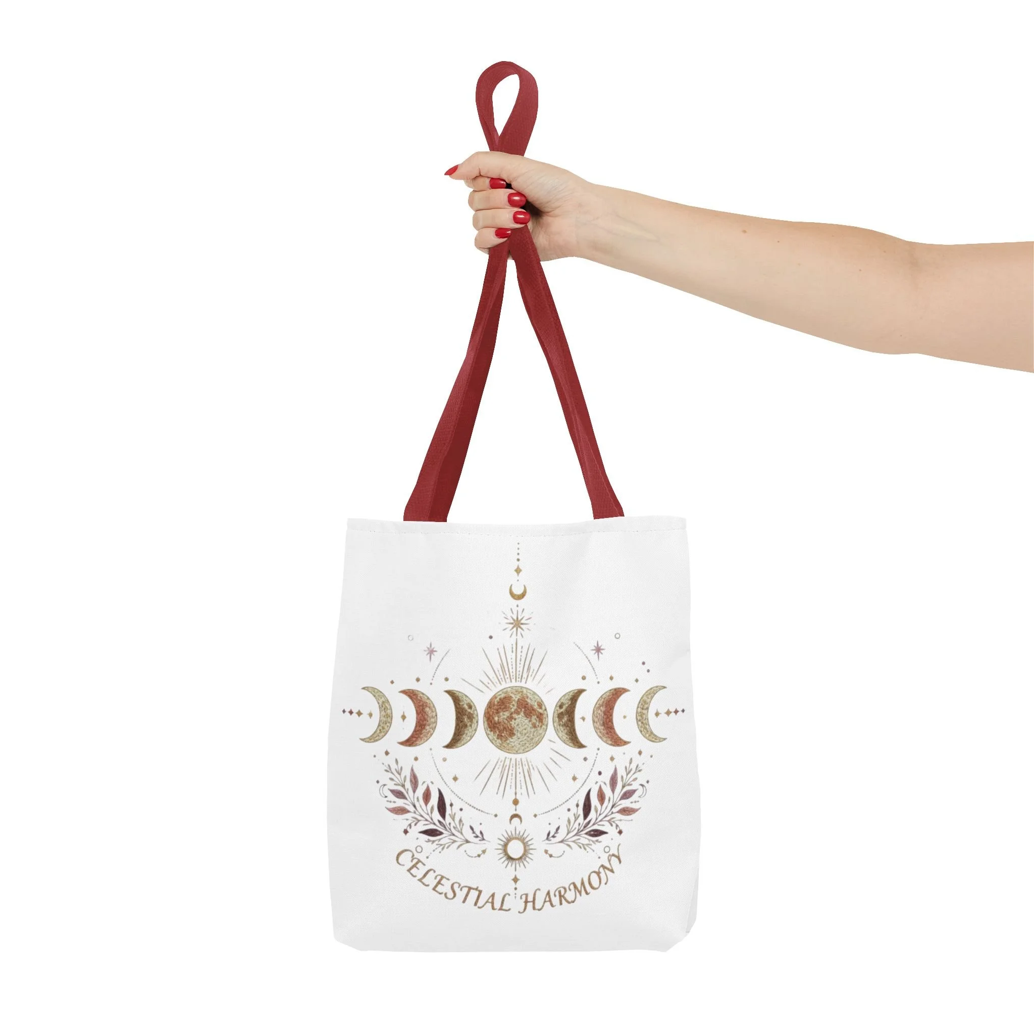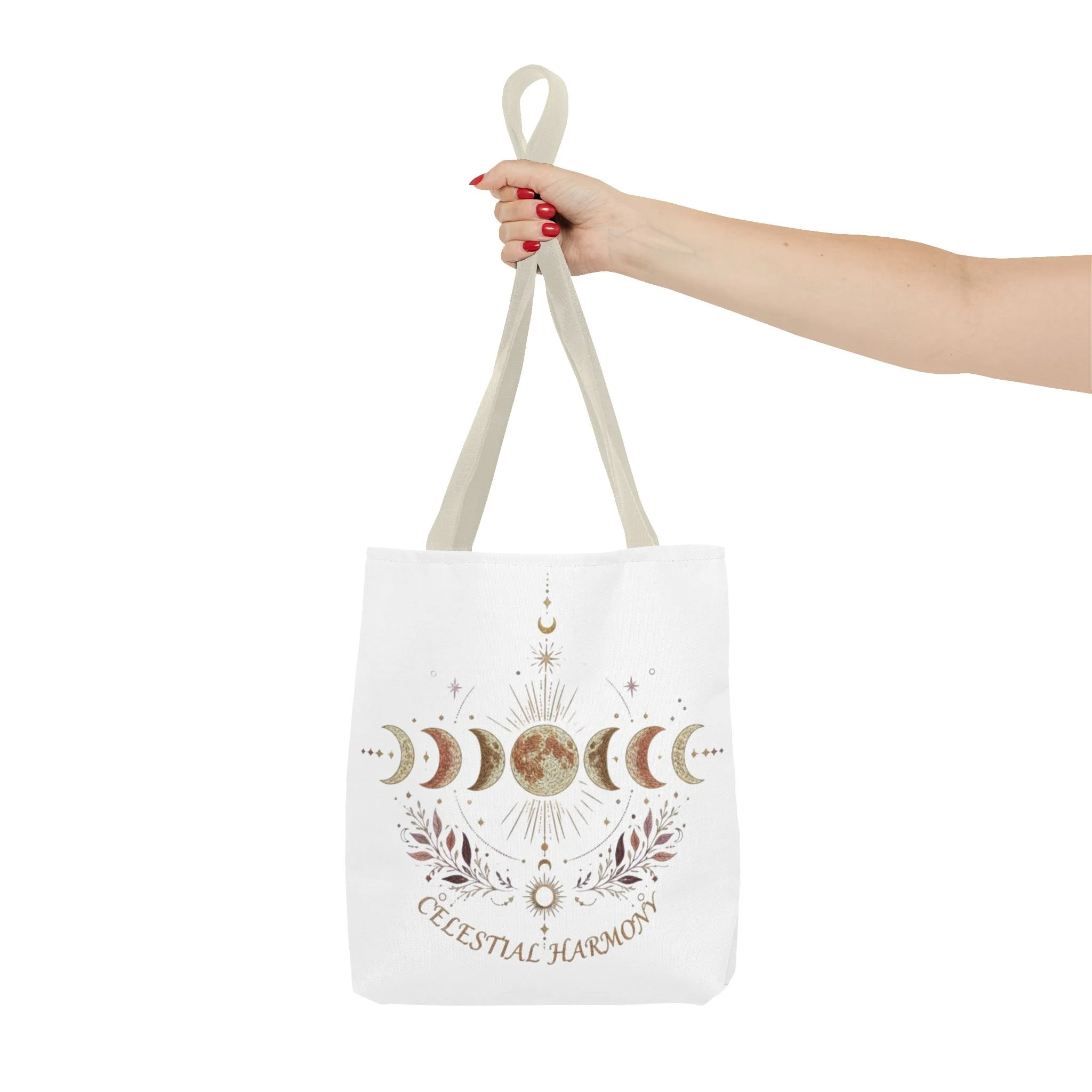 It also makes a thoughtful gift for astrology lovers, moon phase fans, wellness friends, spiritual women, menstrual cycle educators, and anyone who loves celestial-inspired designs. Soft white canvas carries a quiet, lunar altar across its surface — phases of the moon, a textured full moon at center, and delicate botanical flourishes beneath. The composition reads like a small ritual: calm, balanced, and a little bit mystical. Wear it over your shoulder to carry groceries, a sketchbook, or a travel candle; it sits comfortably at your side and adds a touch of celestial calm to everyday outings. The reinforced handles and boxed corners give it structure so the design stays visible, while the subtle gold and blush tones bring an earthy, feminine warmth to city walks, market mornings, or moon circle gatherings.
