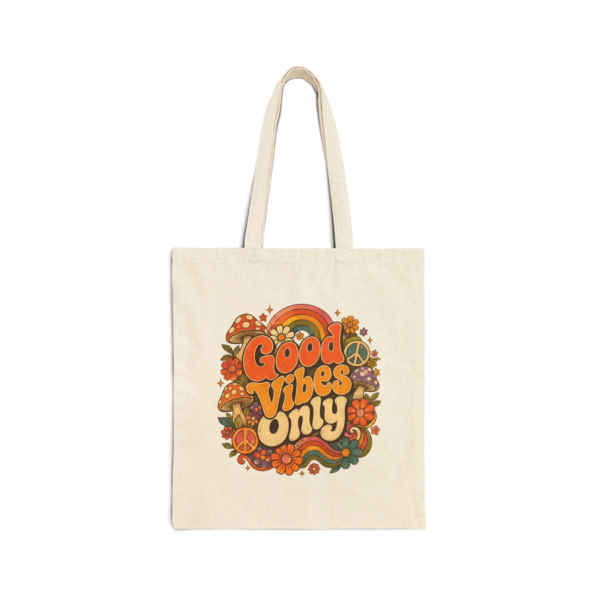 Bring retro joy to every errand with this Vibes Only Canvas Tote Bag, featuring a groovy flower-inspired hippie design made for free spirits, vintage souls, and anyone who loves colorful 70s-style accessories.