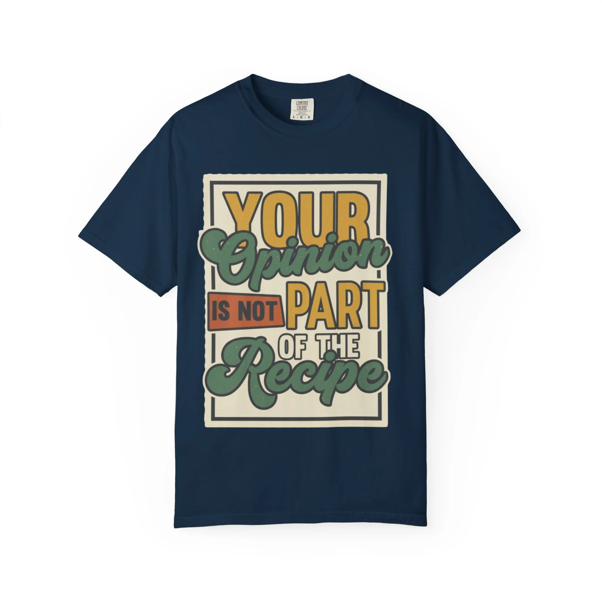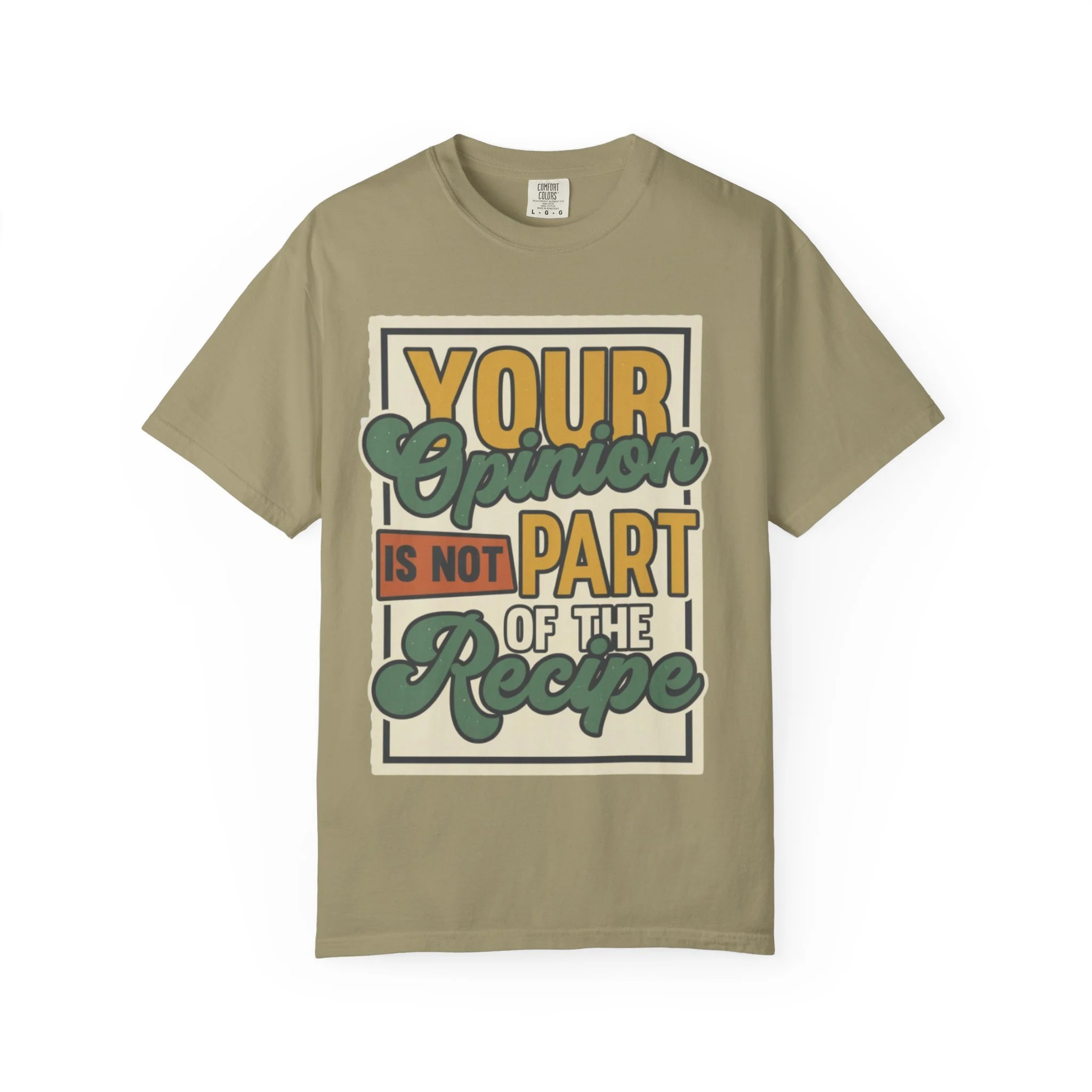 This soft, garment-dyed tee carries a warm, vintage-craftroom vibe — a playful statement printed in retro block and script: “Your opinion is not part of the recipe.” It sits relaxed on the body, washed-down colors and heavyweight cotton giving it a lived-in feel from day one. Wear it while you’re elbow-deep in dough, chopping herbs, or hosting a casual Sunday dinner; the shirt reads like a wink to anyone who knows cooking is as much heart as instruction. The roomy cut and substantial fabric make it comfortable through long kitchen sessions and easy to layer under an apron or over a long-sleeve. With durable double-needle seams and a pre-shrunk knit, it’s built to keep that favorite worn-in look for years.