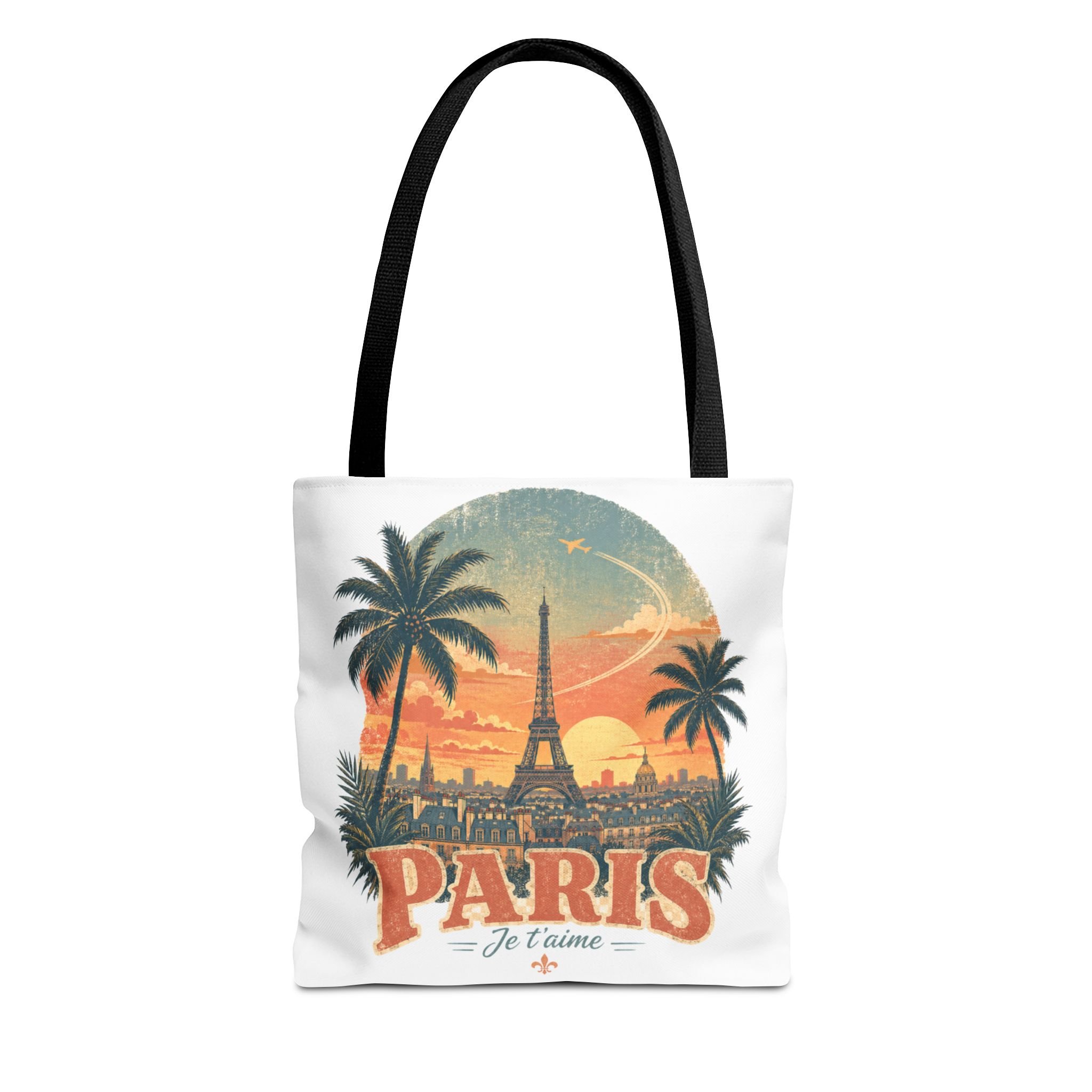 It also makes a thoughtful gift for travelers, Paris lovers, beach girls, vacation lovers, students, moms, and friends who love vintage summer vibes.Carry a little Parisian sunset with you. This roomy tote features a vintage-style illustration of the Eiffel Tower framed by palms and an orange dusk sky — city romance with a relaxed, travel-worn vibe. The durable polyester body holds its shape and dries fast after rainy market runs. Boxed corners add depth for groceries, books, or a sketchbook and supplies. Reinforced handle stitching and a non-woven laminate interior mean this bag stands up to daily errands, beach days, and weekend wandering through cobblestone streets. Each tote comes with your choice of handle color to match your mood and three size options so you can pick the fit that suits your routine.