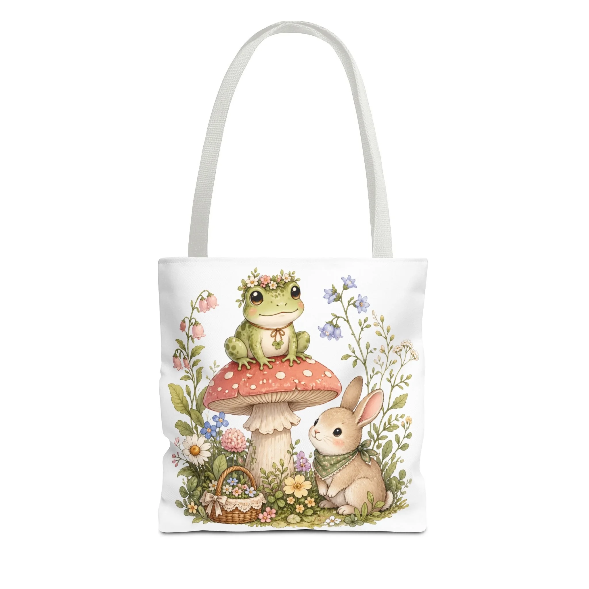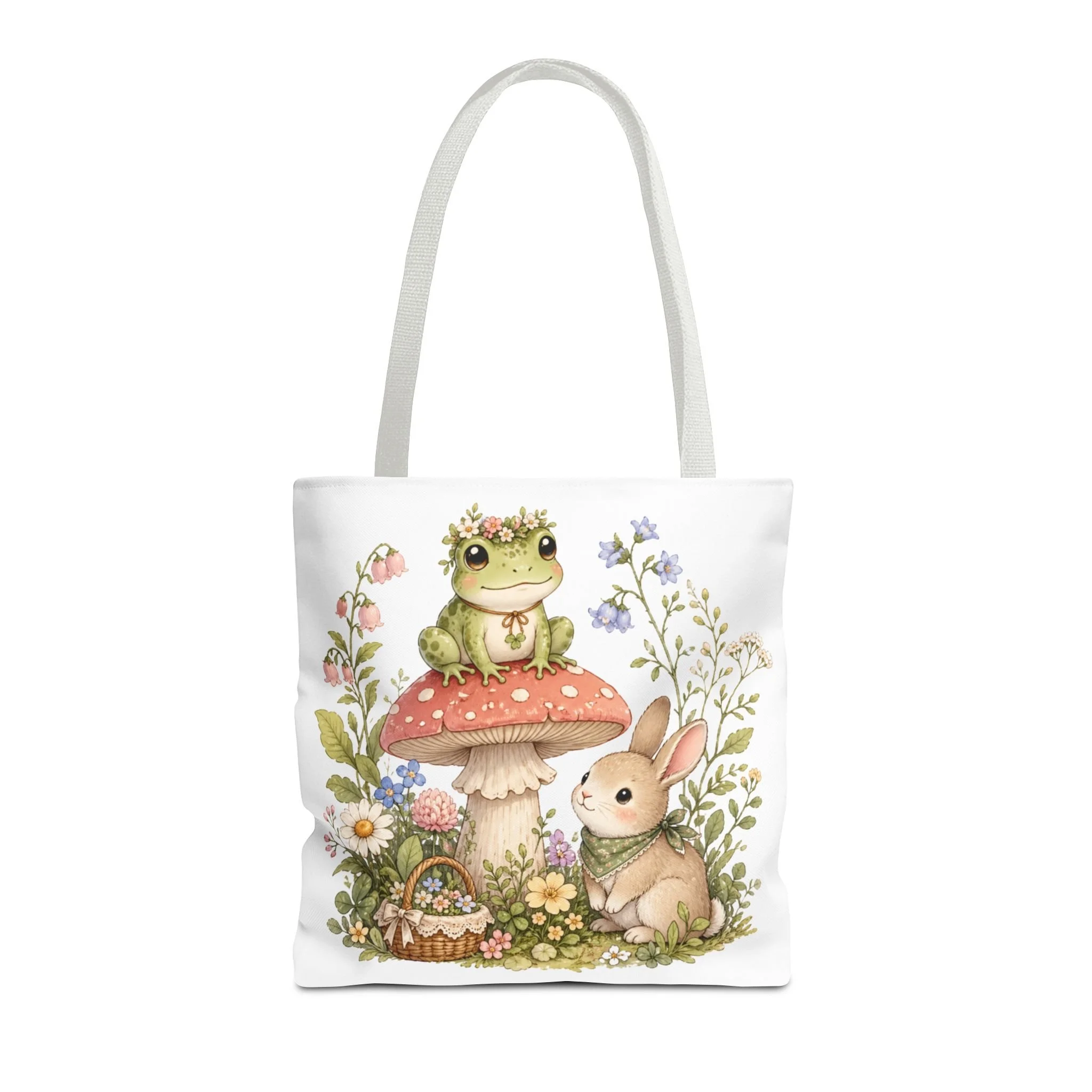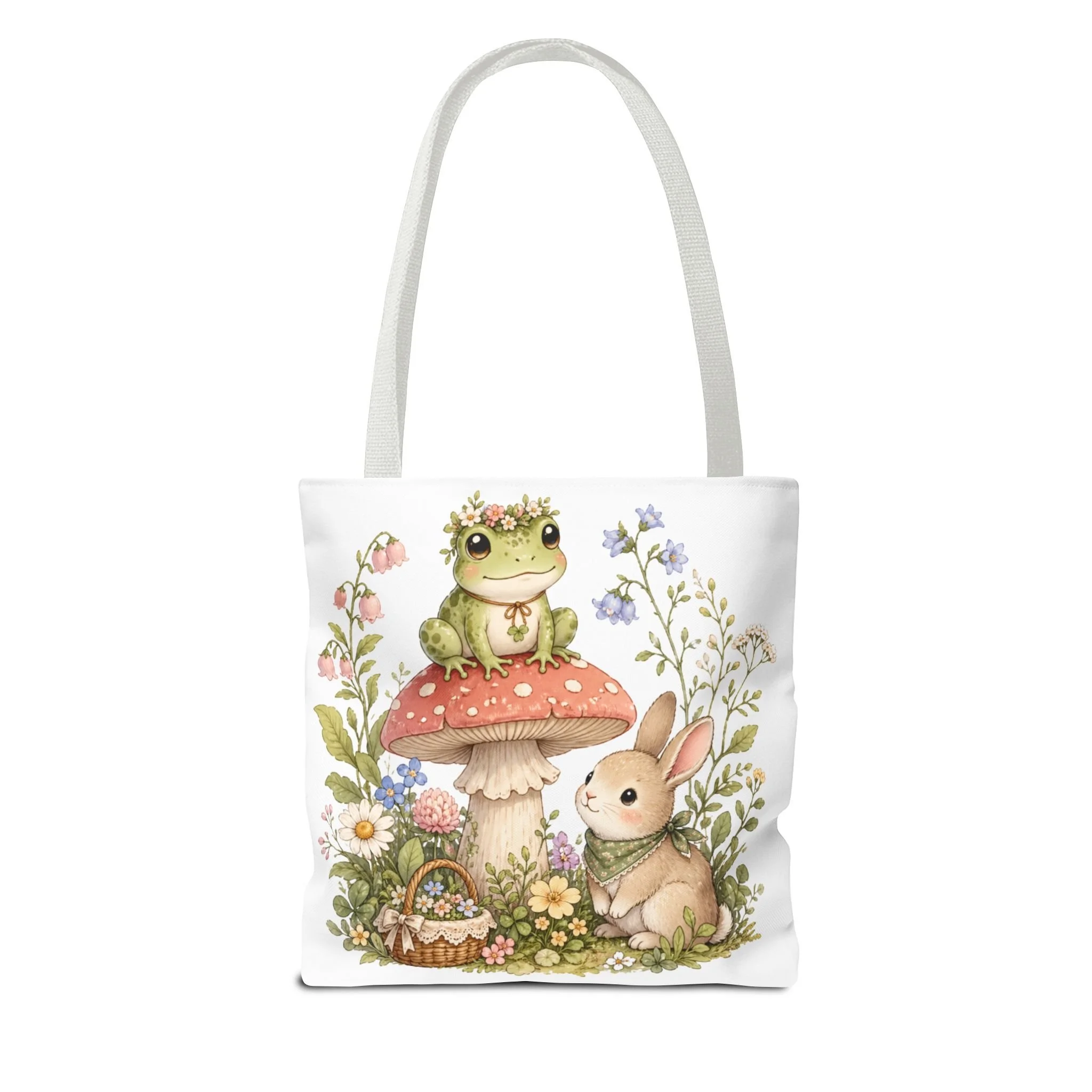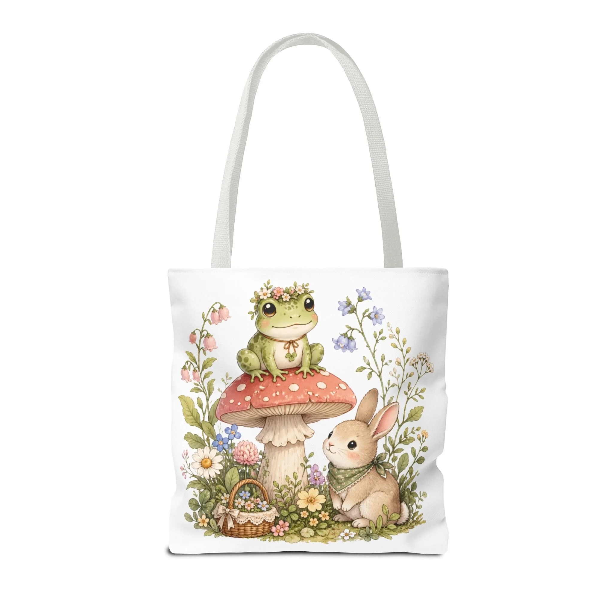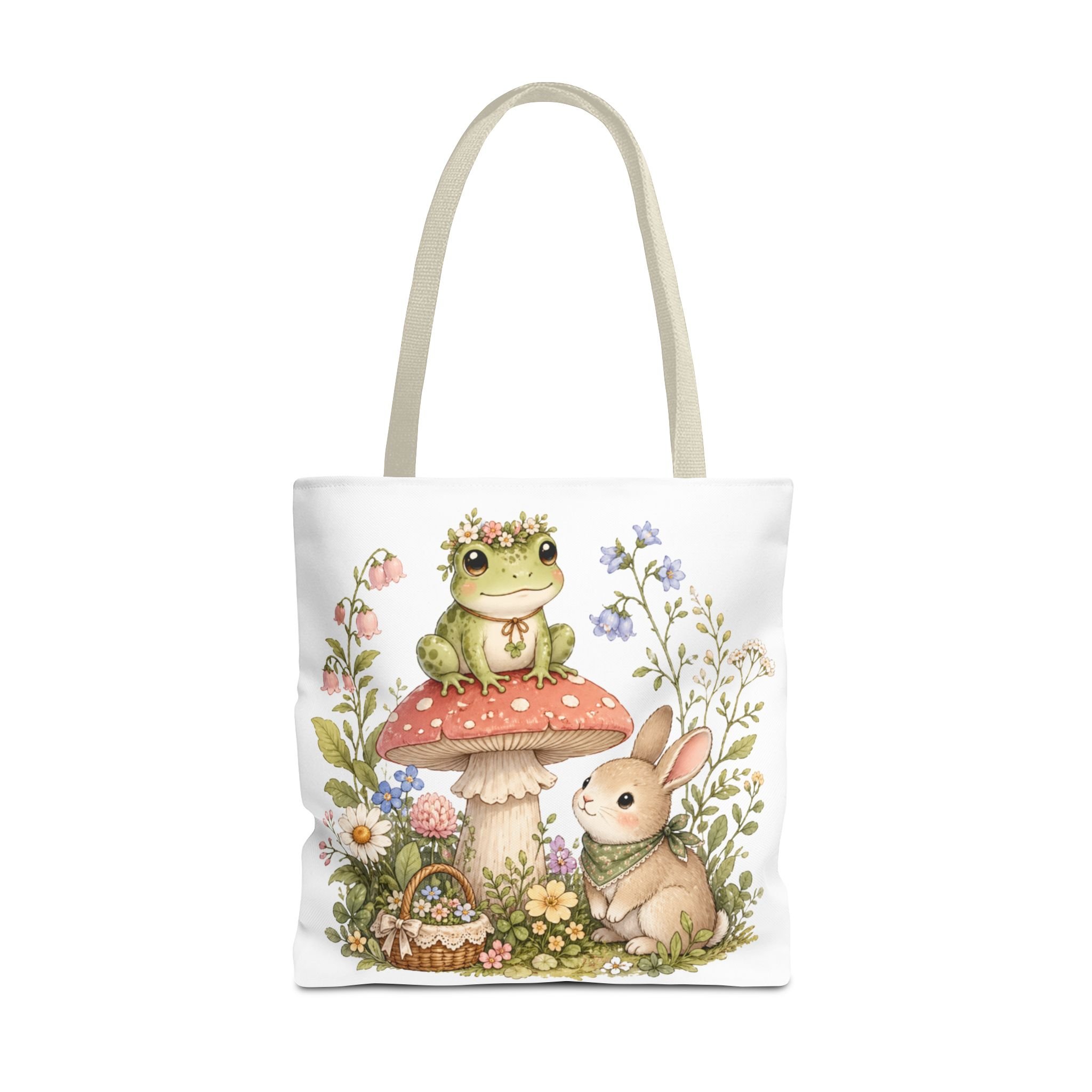 It also makes a thoughtful gift for frog lovers, bunny lovers, mushroom fans, cottagecore friends, nature lovers, teachers, students, and anyone who enjoys soft, floral forest designs. This charming tote brings a gentle, storybook moment to everyday errands. Soft watercolors depict a wide-eyed frog perched on a spotted mushroom beside a curious bunny, surrounded by wildflowers and a tiny picnic basket. The roomy, structured bag keeps the illustration bright and crisp on a durable polyester canvas that holds its shape day after day. Carry it to markets, nature walks, or library visits — it feels like a miniature escape to a sunlit meadow whenever you sling it over your shoulder.
