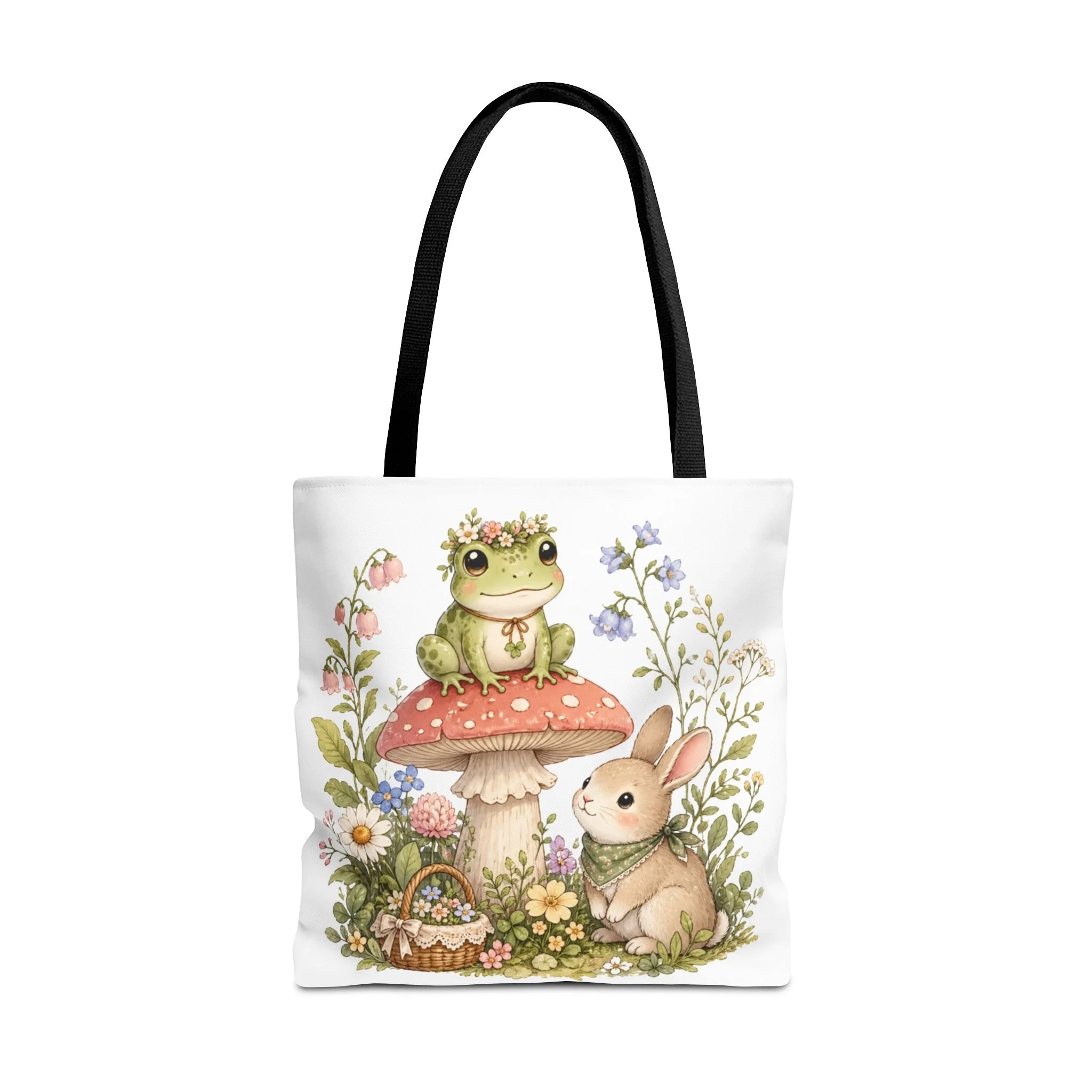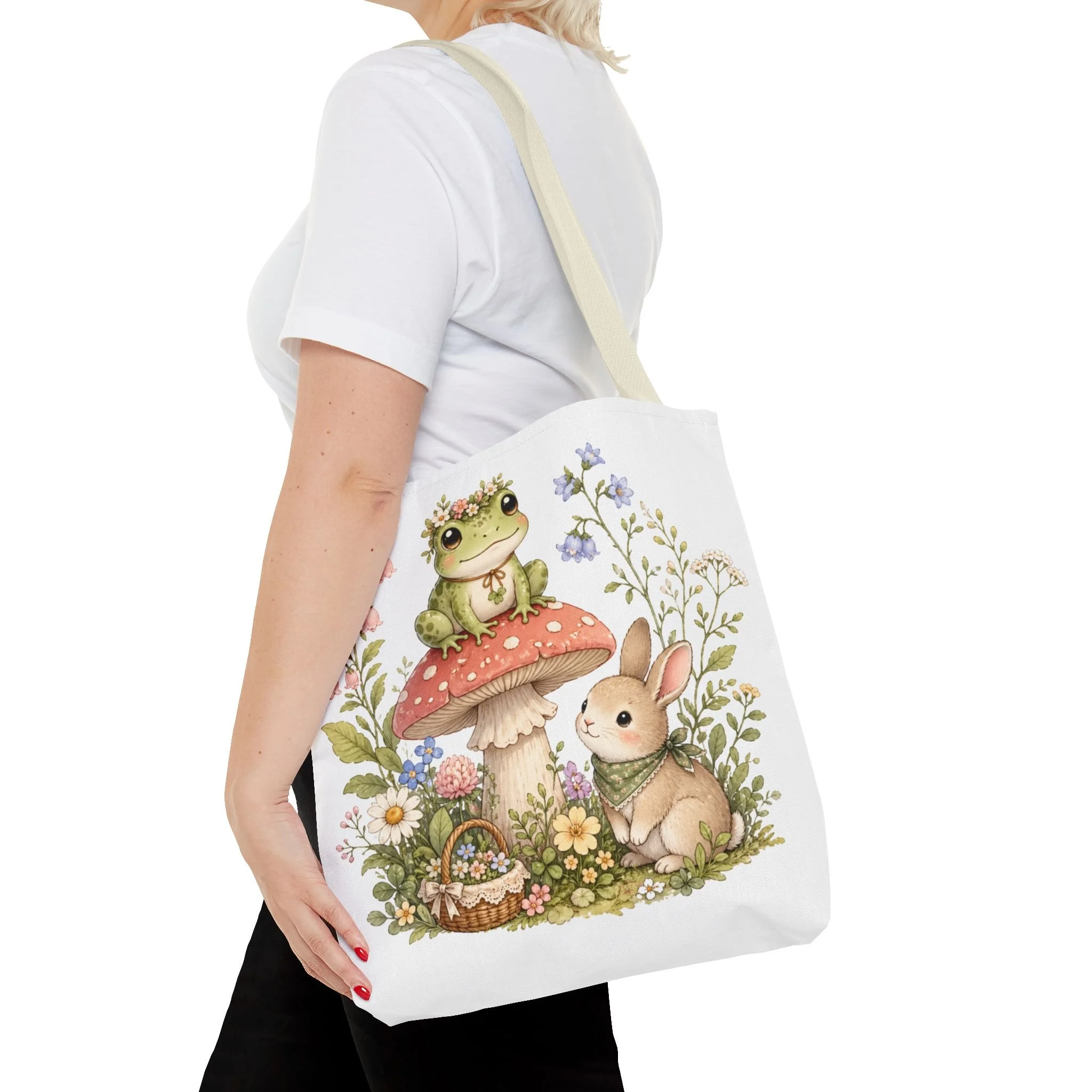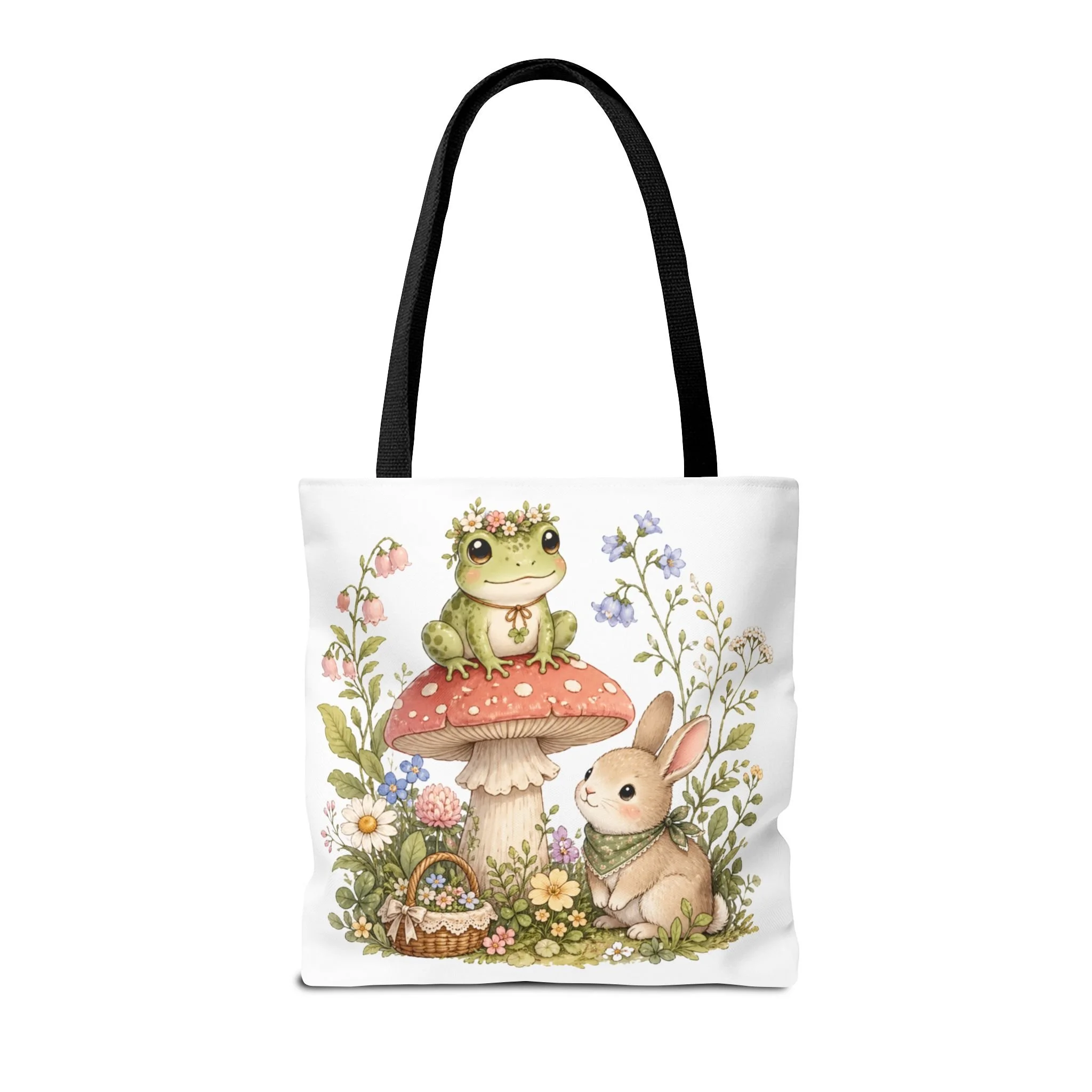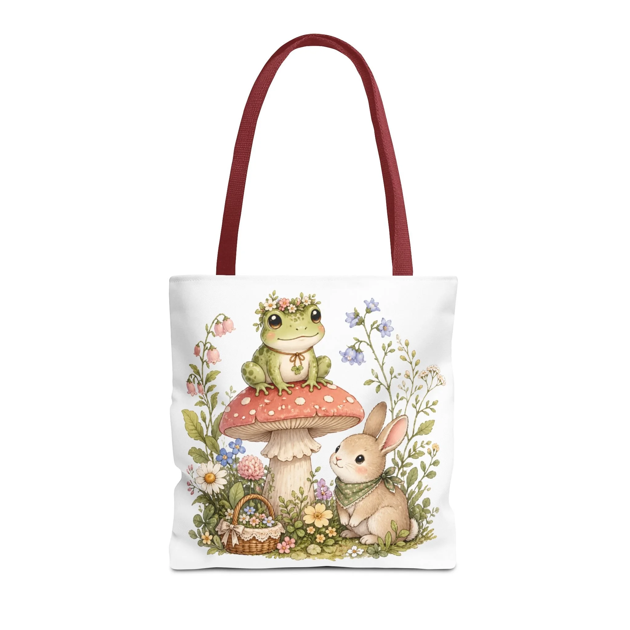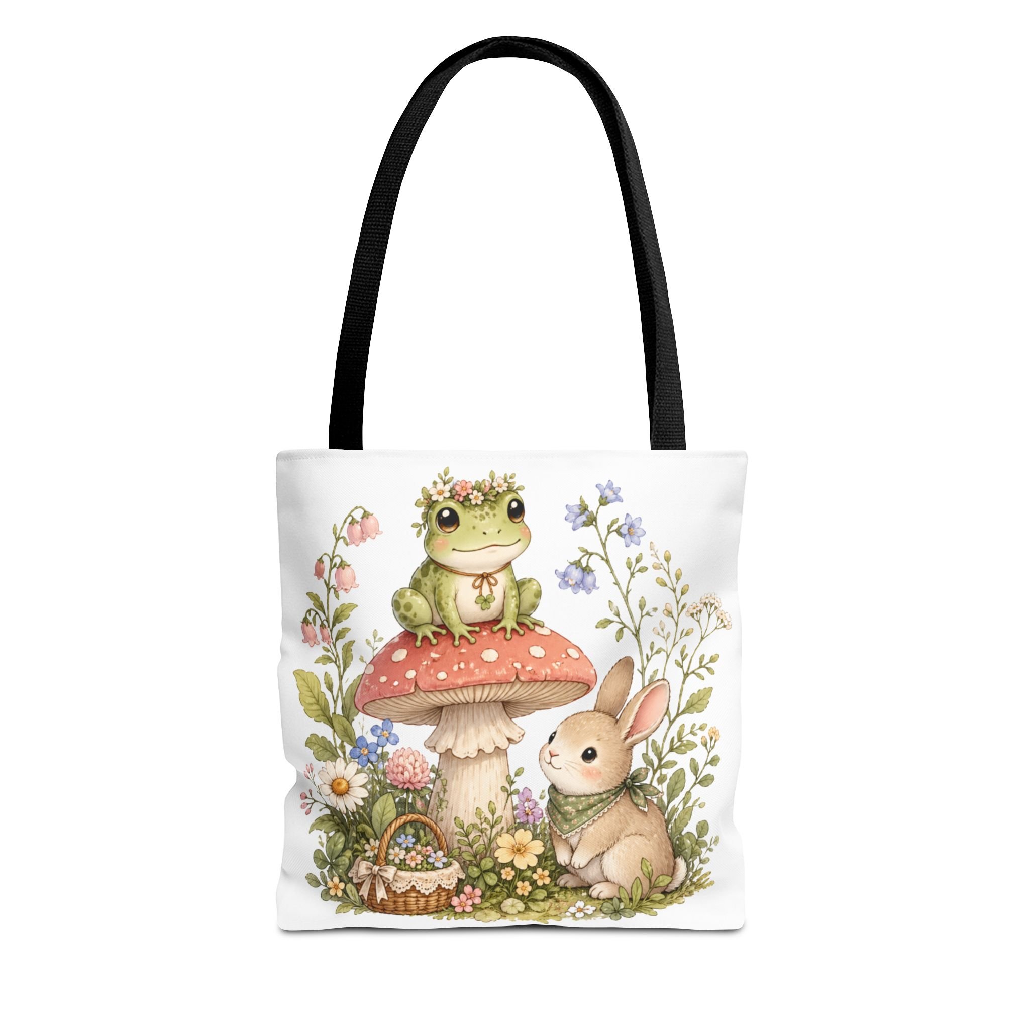 It also makes a thoughtful gift for frog lovers, bunny lovers, mushroom fans, cottagecore friends, nature lovers, teachers, students, and anyone who enjoys soft, floral forest designs. This charming tote brings a gentle, storybook moment to everyday errands. Soft watercolors depict a wide-eyed frog perched on a spotted mushroom beside a curious bunny, surrounded by wildflowers and a tiny picnic basket. The roomy, structured bag keeps the illustration bright and crisp on a durable polyester canvas that holds its shape day after day. Carry it to markets, nature walks, or library visits — it feels like a miniature escape to a sunlit meadow whenever you sling it over your shoulder.