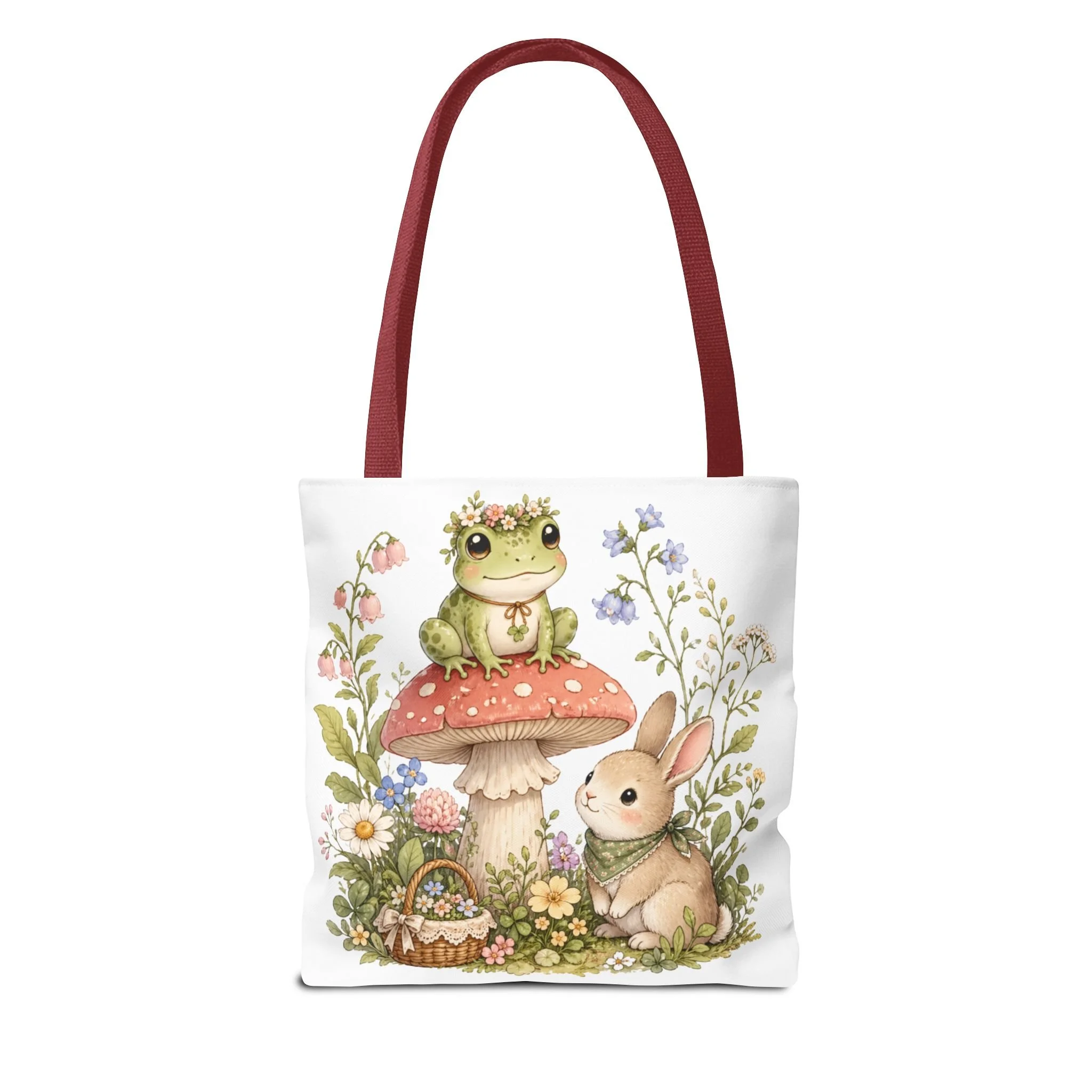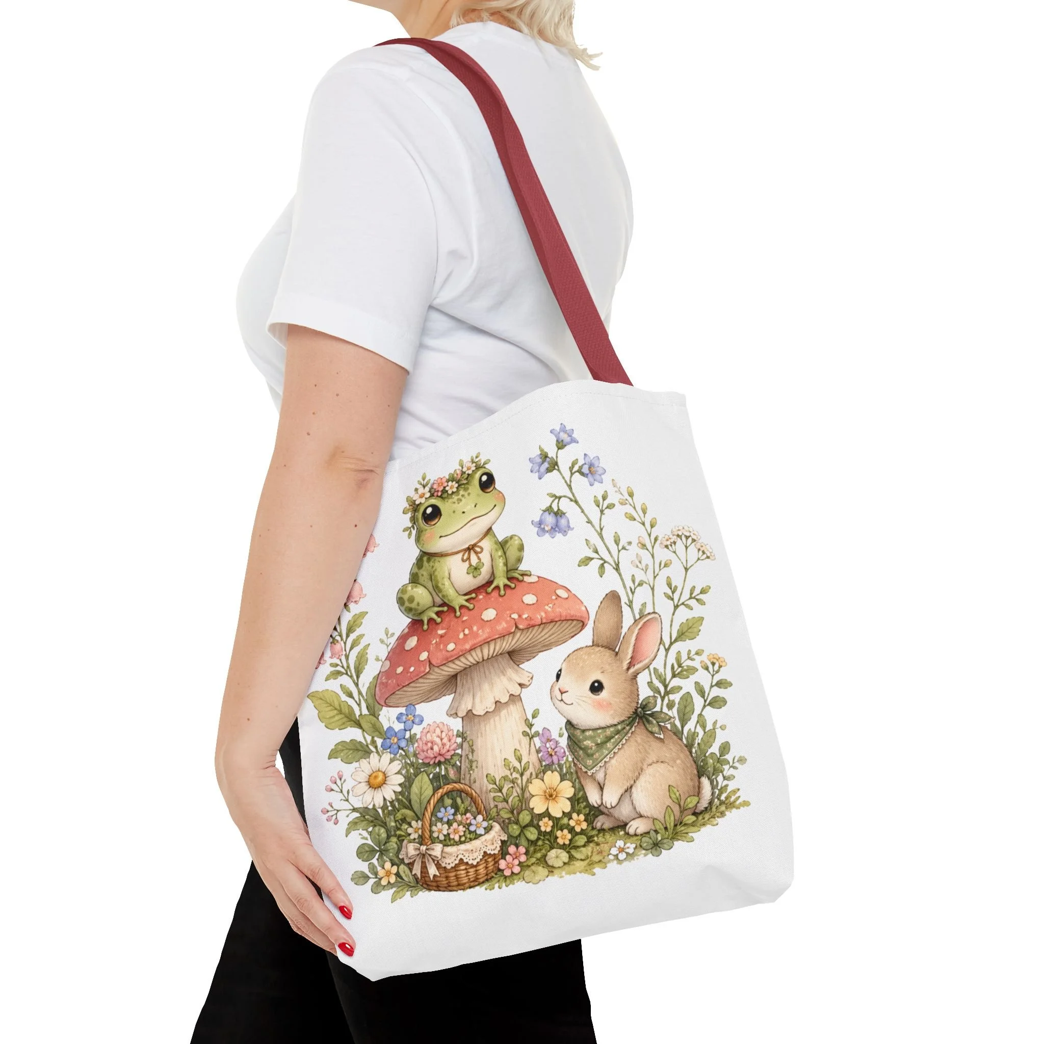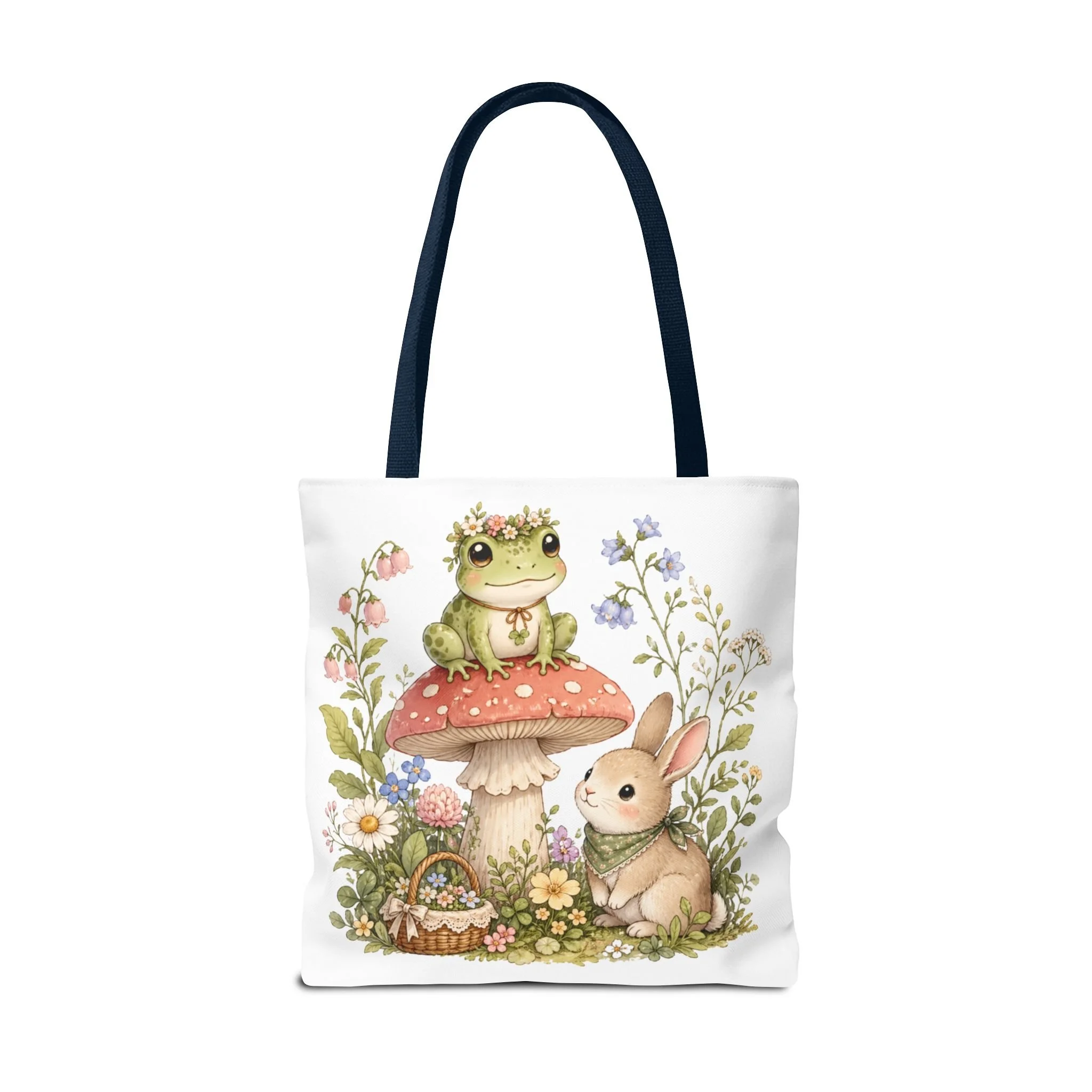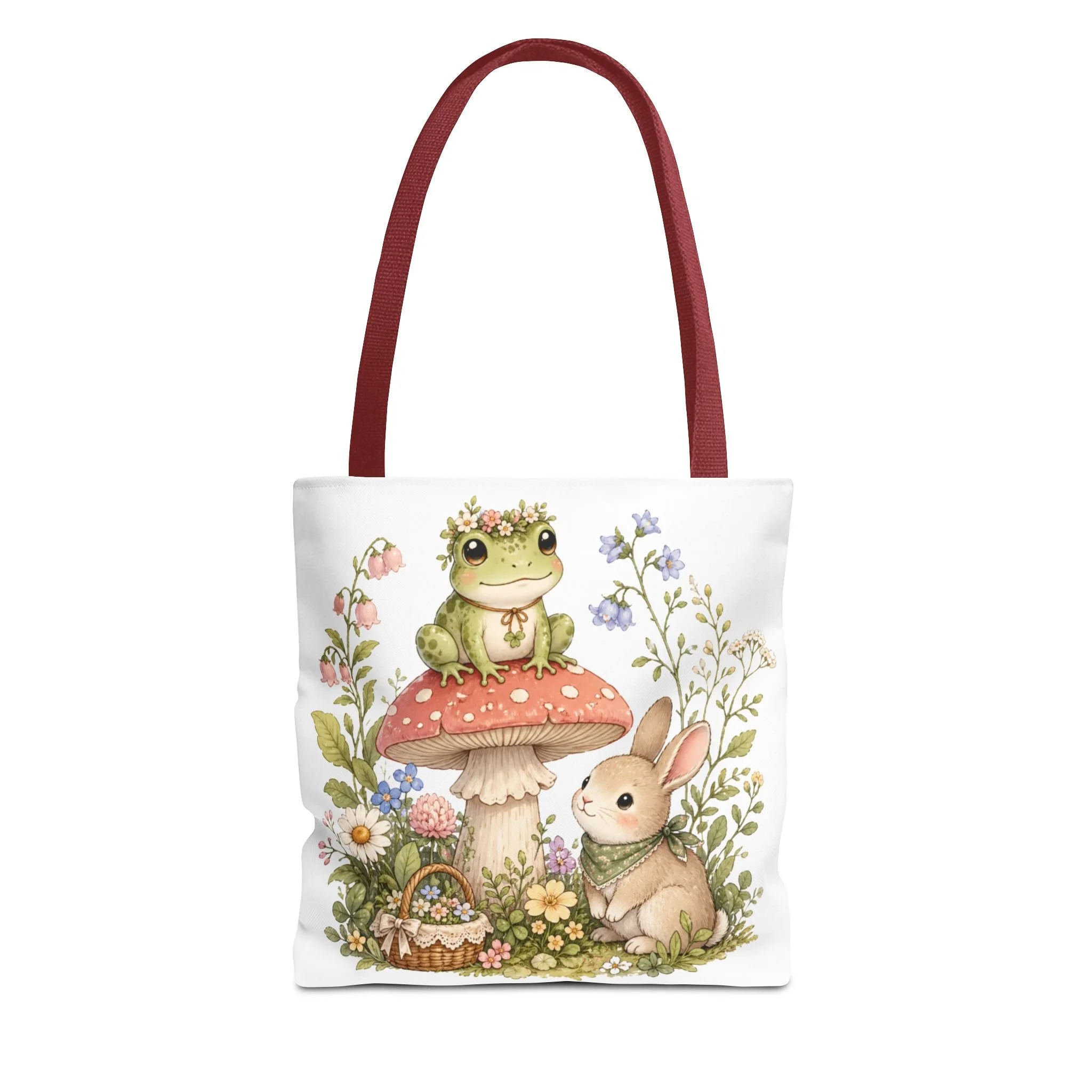 It also makes a thoughtful gift for frog lovers, bunny lovers, mushroom fans, cottagecore friends, nature lovers, teachers, students, and anyone who enjoys soft, floral forest designs. This charming tote brings a gentle, storybook moment to everyday errands. Soft watercolors depict a wide-eyed frog perched on a spotted mushroom beside a curious bunny, surrounded by wildflowers and a tiny picnic basket. The roomy, structured bag keeps the illustration bright and crisp on a durable polyester canvas that holds its shape day after day. Carry it to markets, nature walks, or library visits — it feels like a miniature escape to a sunlit meadow whenever you sling it over your shoulder.