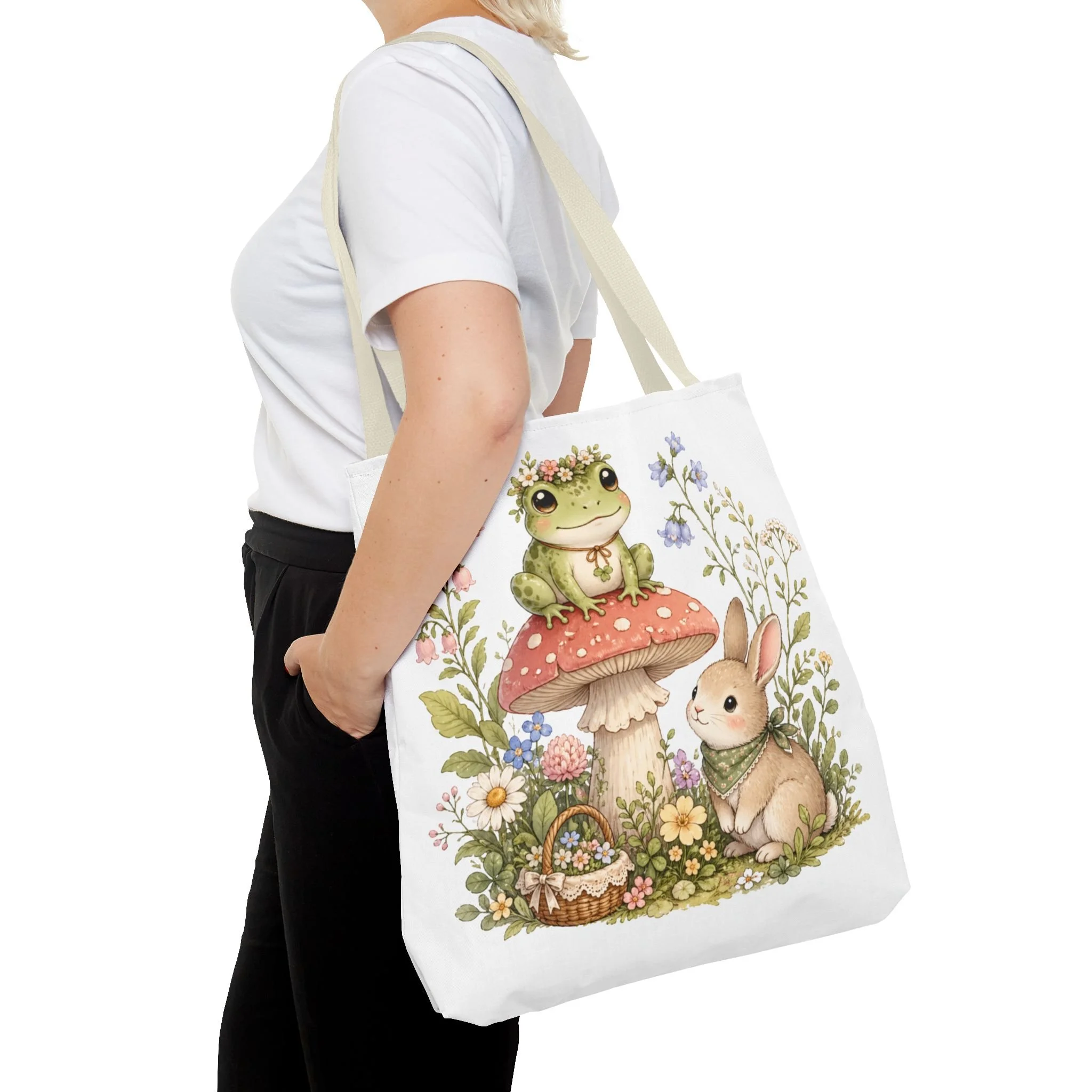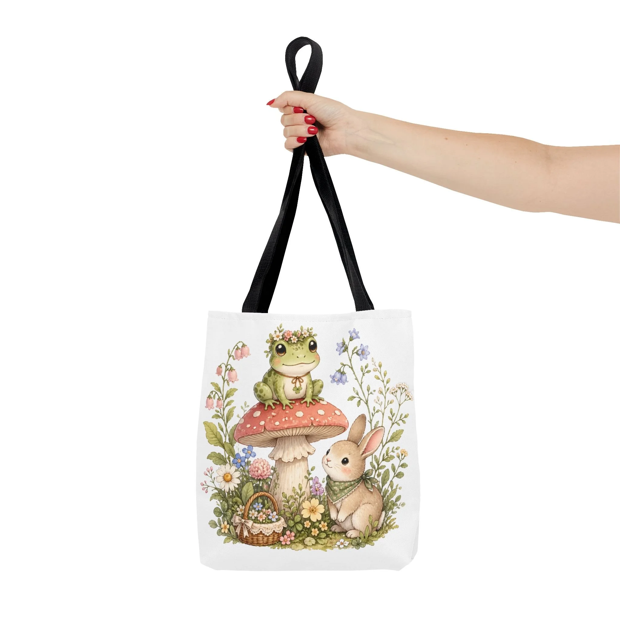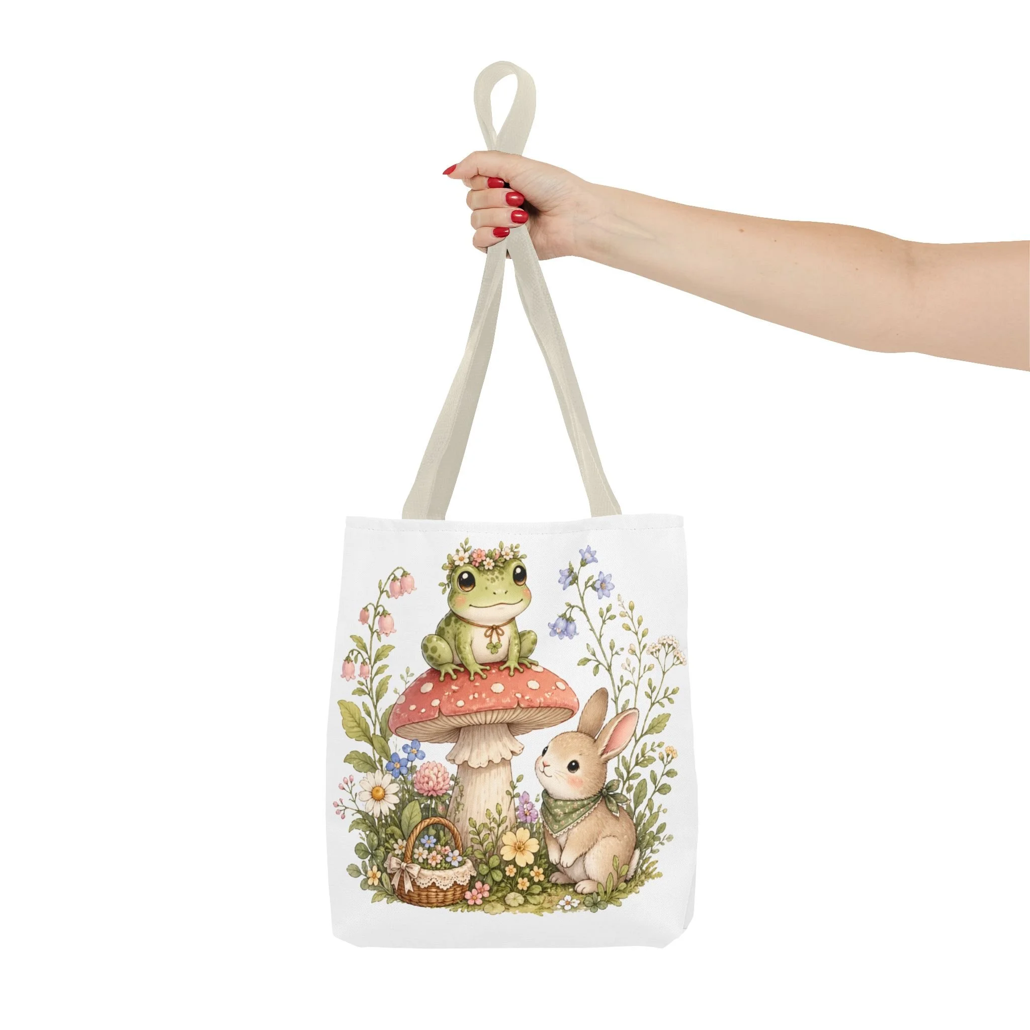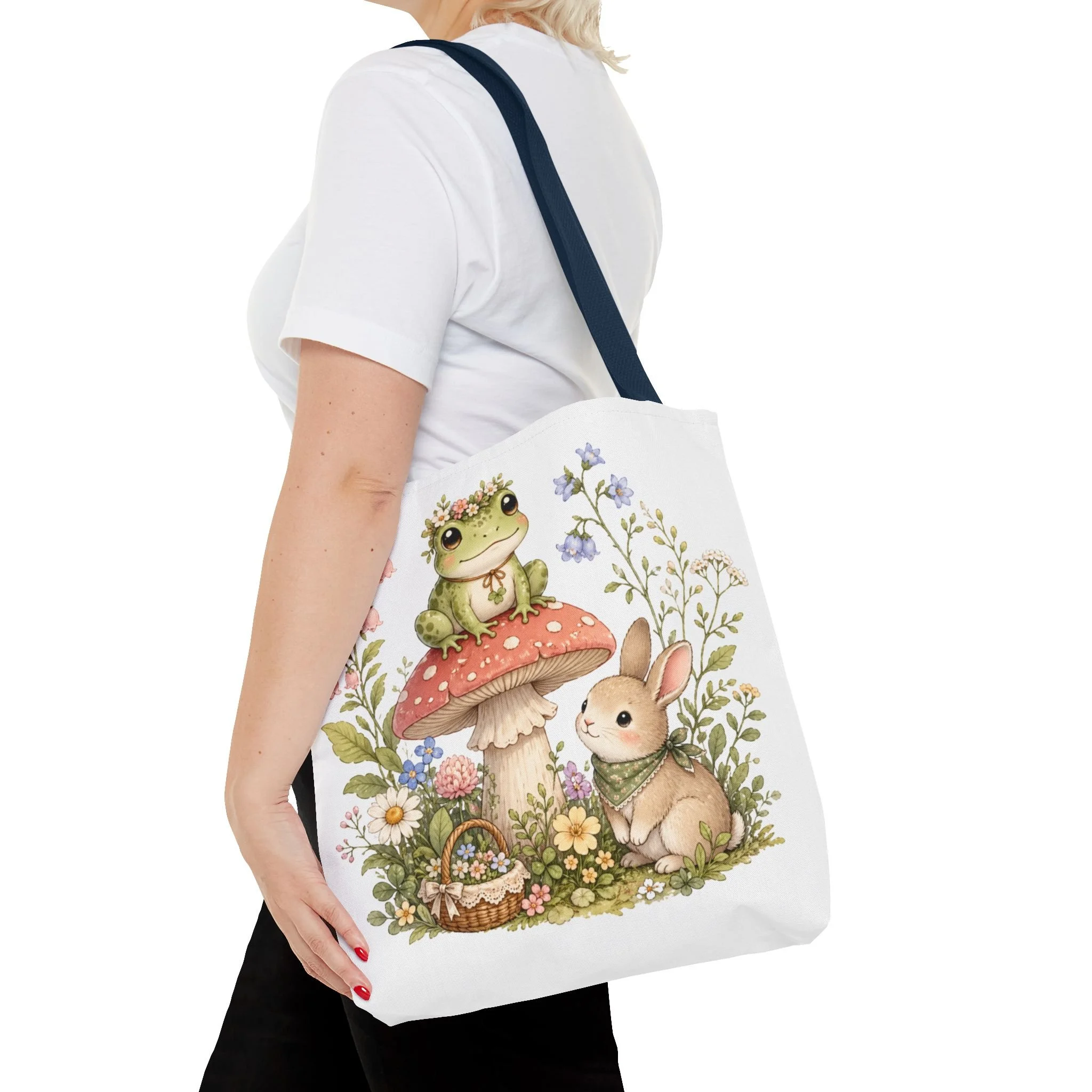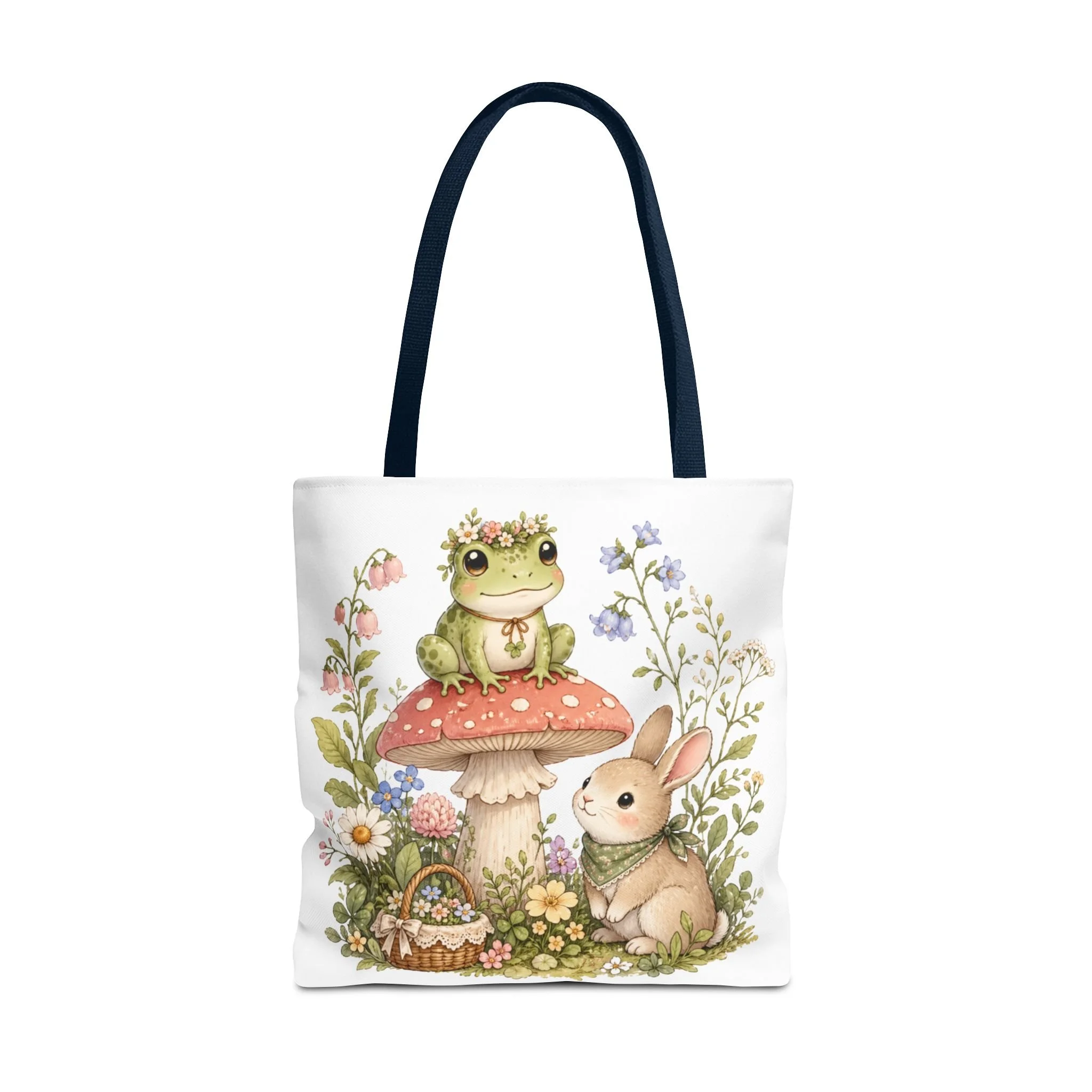 It also makes a thoughtful gift for frog lovers, bunny lovers, mushroom fans, cottagecore friends, nature lovers, teachers, students, and anyone who enjoys soft, floral forest designs. This charming tote brings a gentle, storybook moment to everyday errands. Soft watercolors depict a wide-eyed frog perched on a spotted mushroom beside a curious bunny, surrounded by wildflowers and a tiny picnic basket. The roomy, structured bag keeps the illustration bright and crisp on a durable polyester canvas that holds its shape day after day. Carry it to markets, nature walks, or library visits — it feels like a miniature escape to a sunlit meadow whenever you sling it over your shoulder.