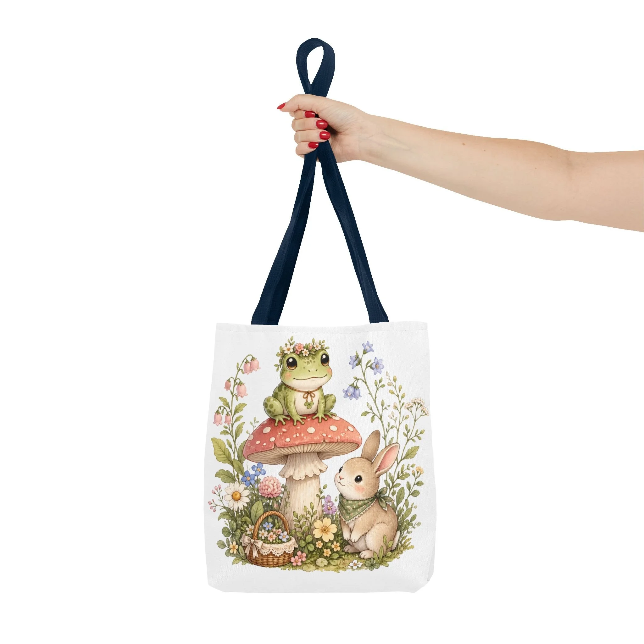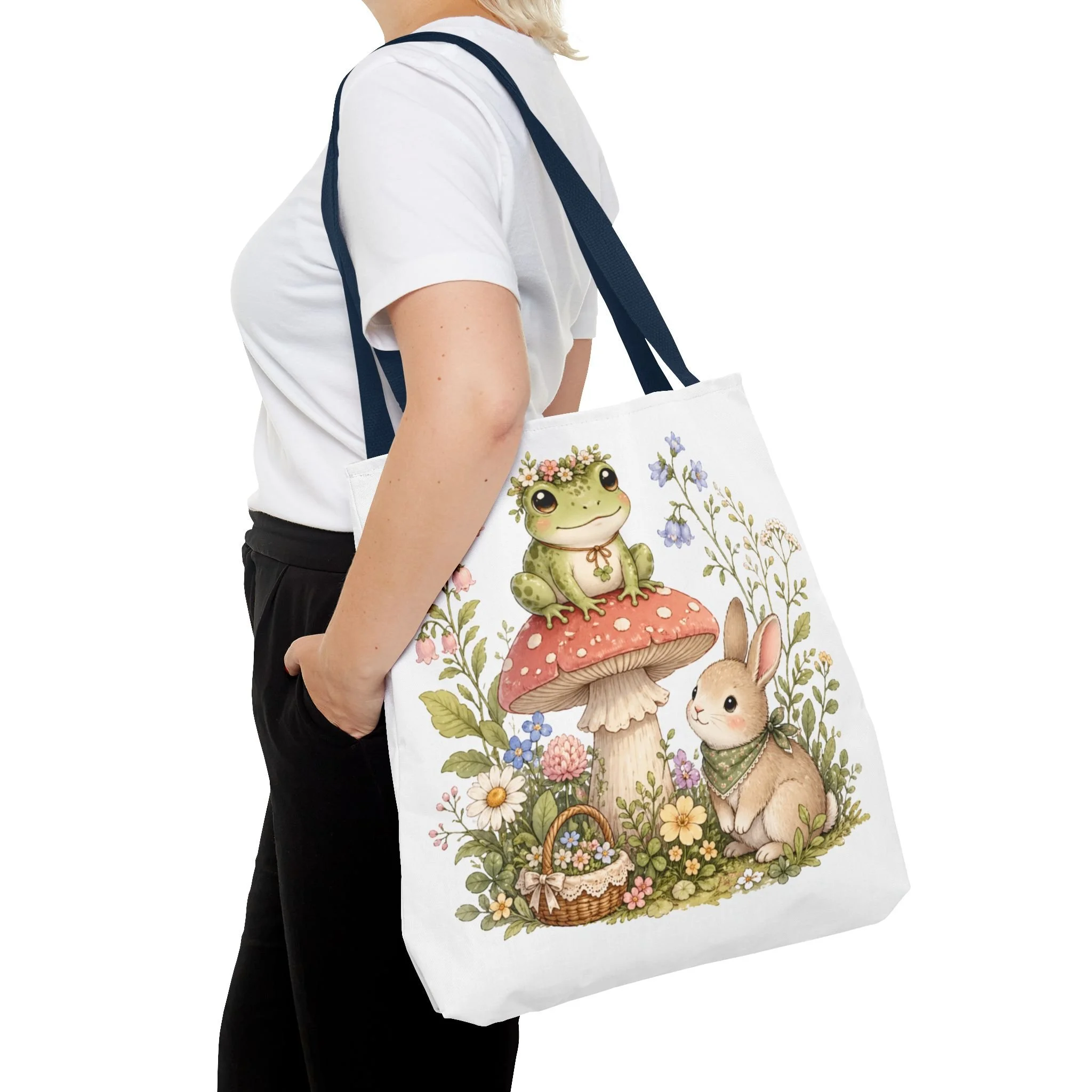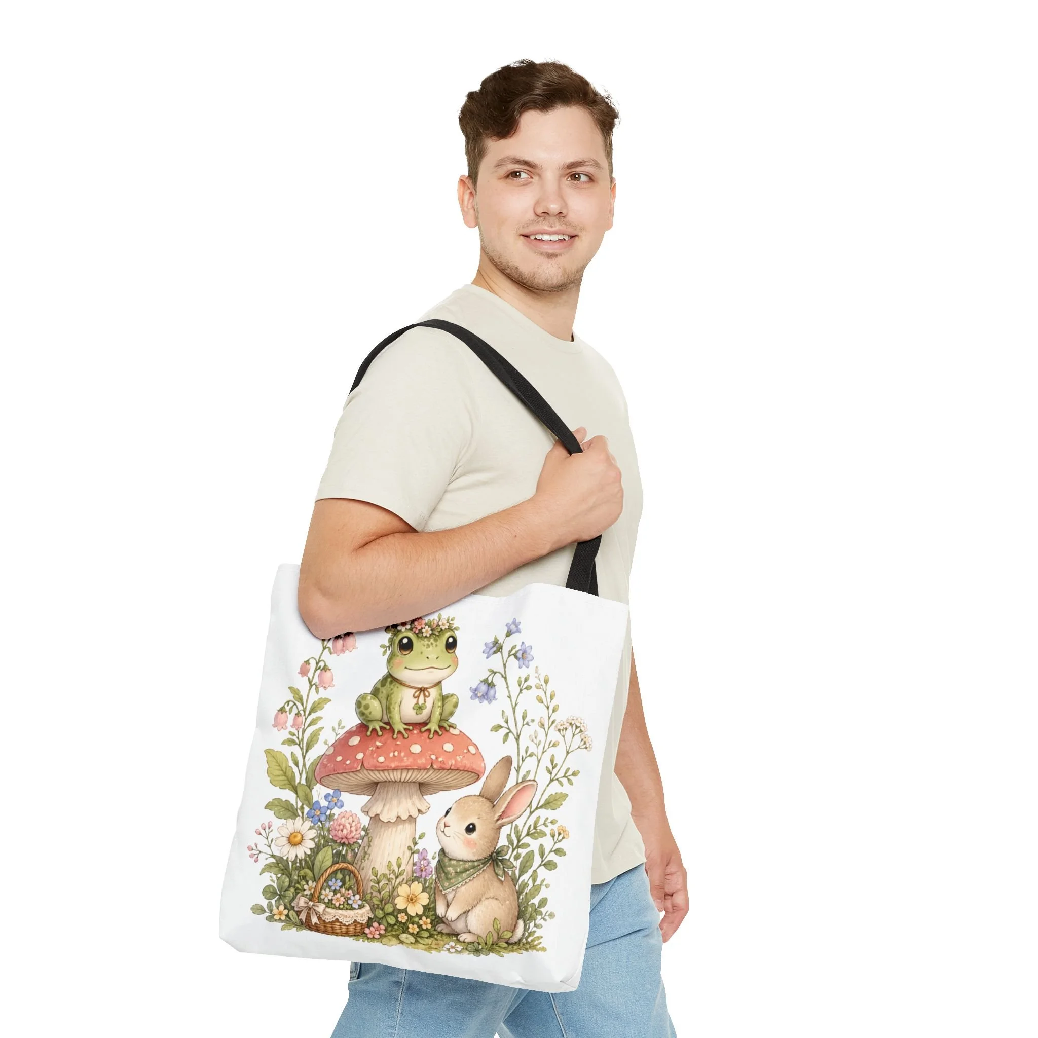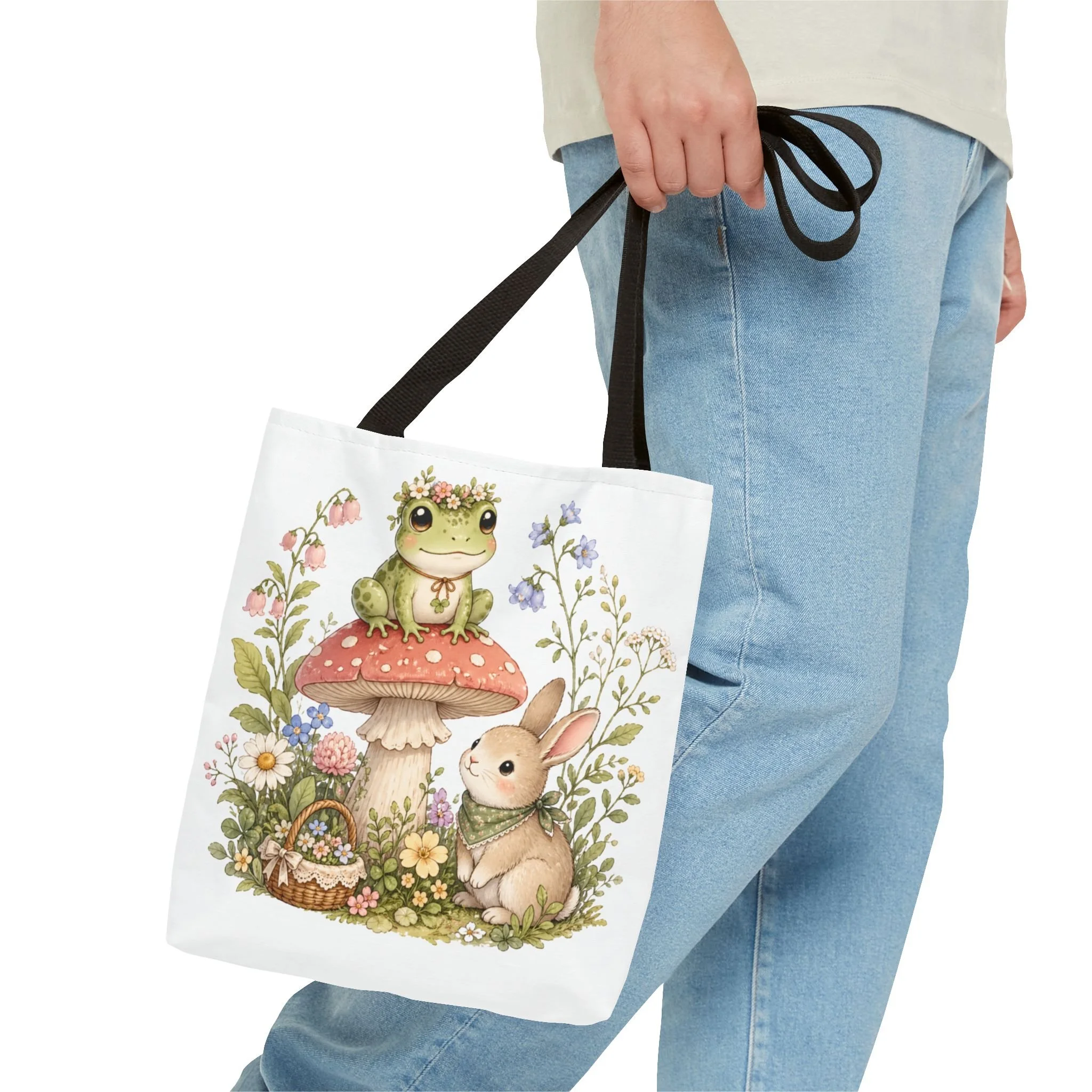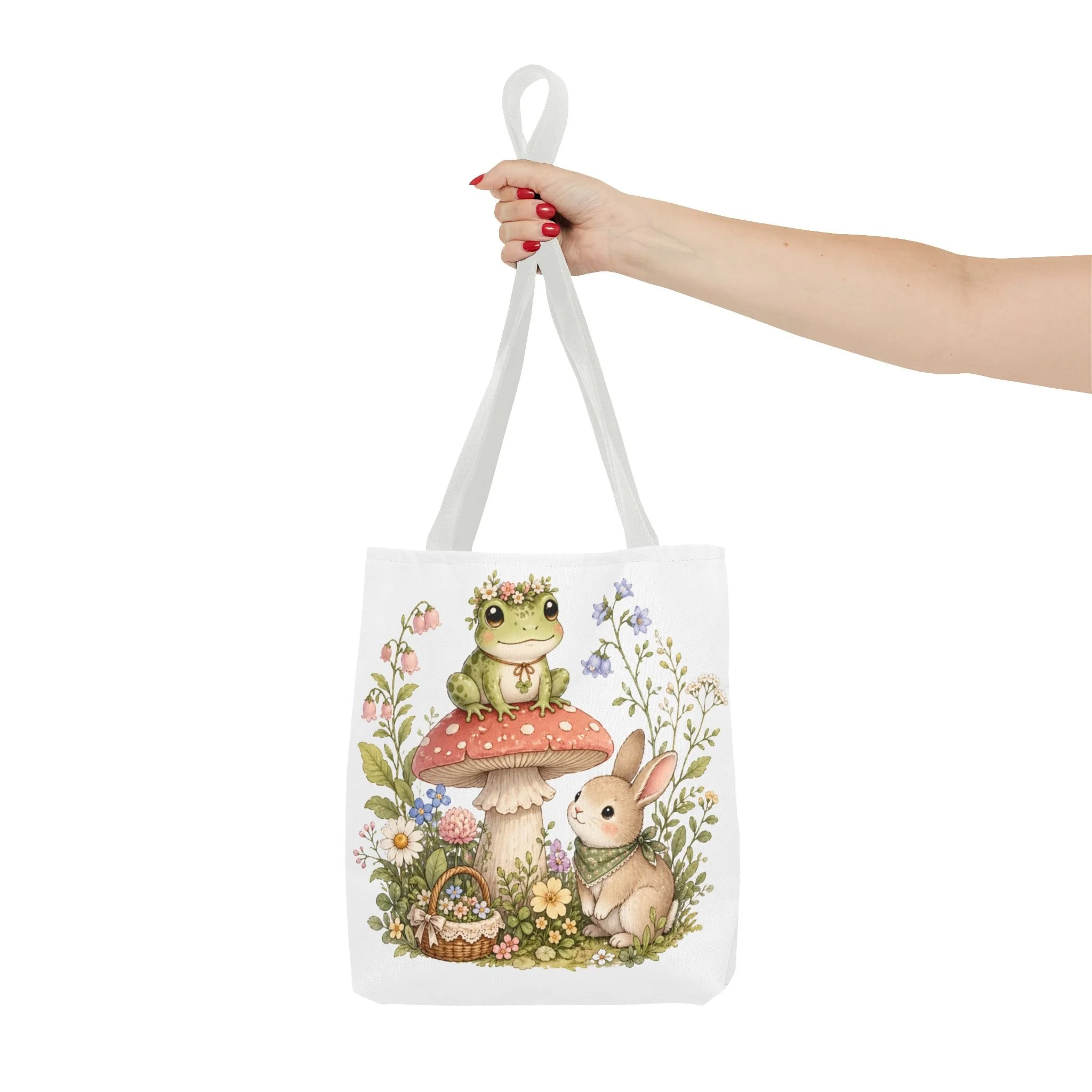 It also makes a thoughtful gift for frog lovers, bunny lovers, mushroom fans, cottagecore friends, nature lovers, teachers, students, and anyone who enjoys soft, floral forest designs. This charming tote brings a gentle, storybook moment to everyday errands. Soft watercolors depict a wide-eyed frog perched on a spotted mushroom beside a curious bunny, surrounded by wildflowers and a tiny picnic basket. The roomy, structured bag keeps the illustration bright and crisp on a durable polyester canvas that holds its shape day after day. Carry it to markets, nature walks, or library visits — it feels like a miniature escape to a sunlit meadow whenever you sling it over your shoulder.