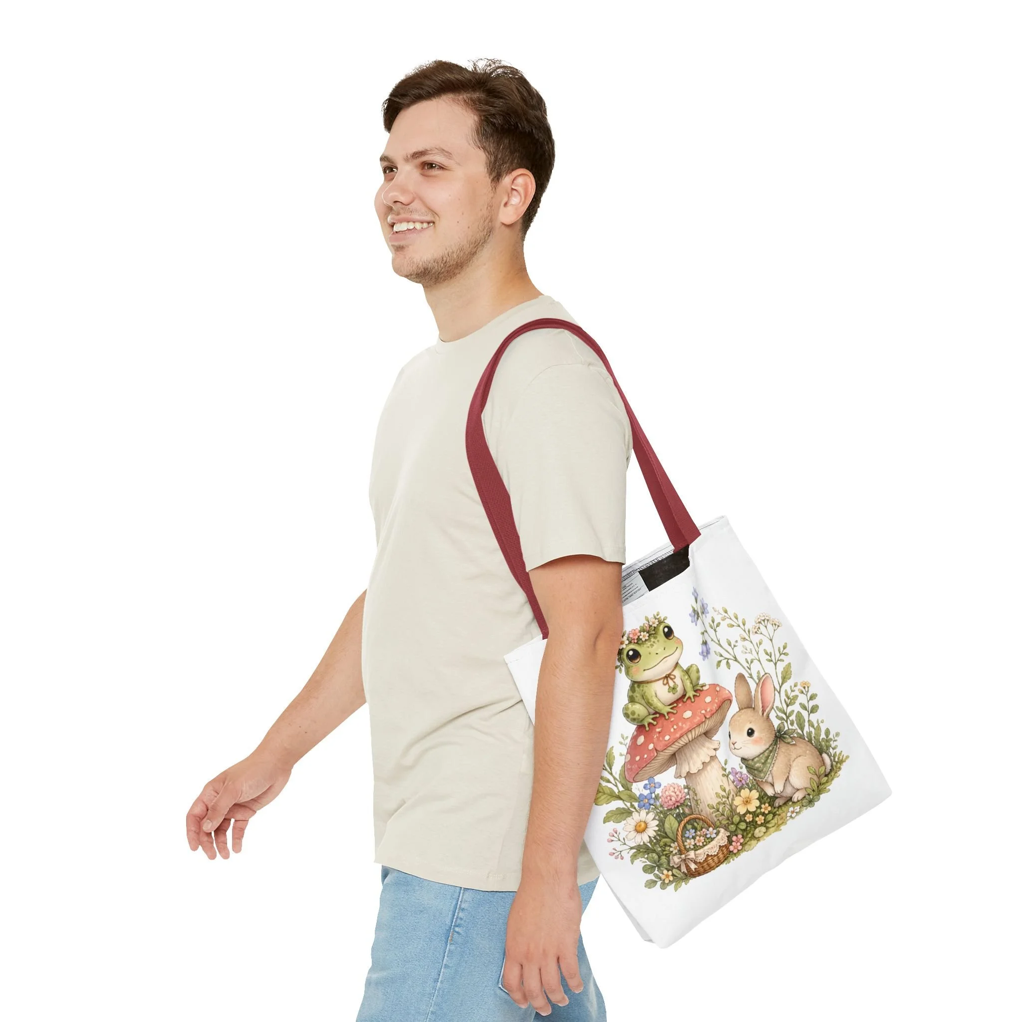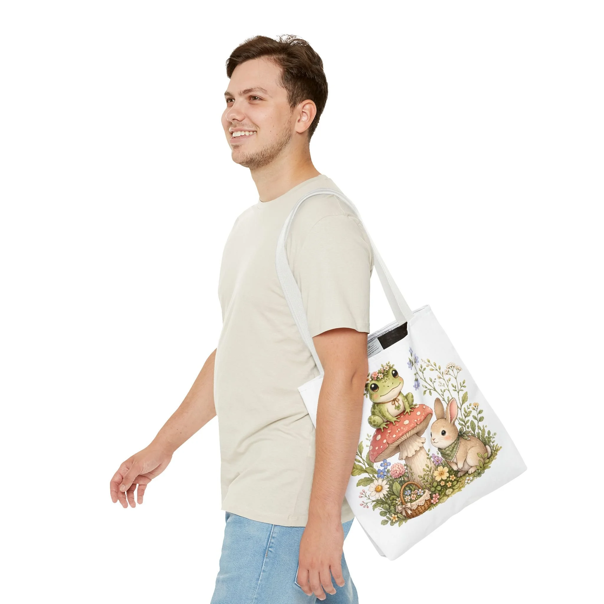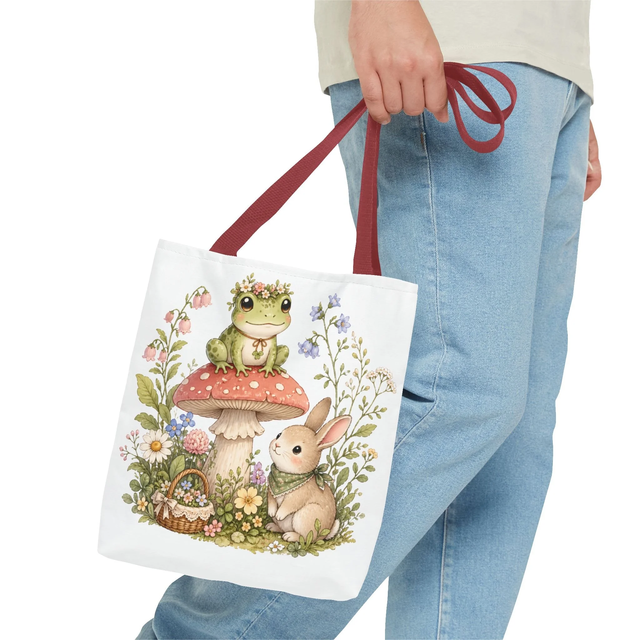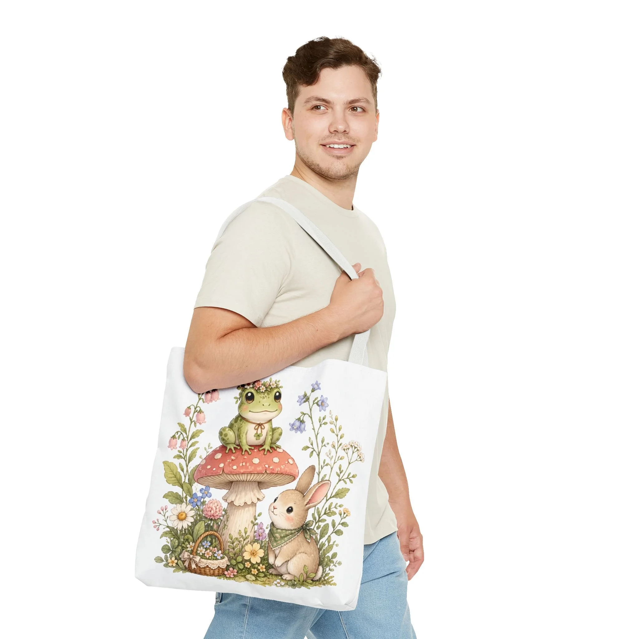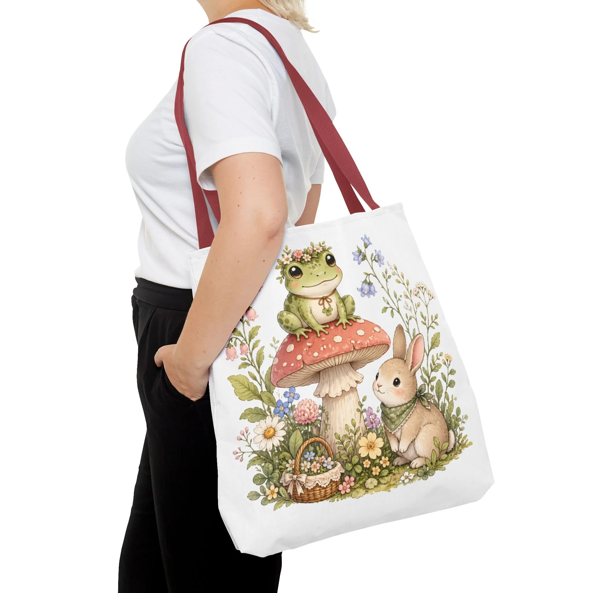 It also makes a thoughtful gift for frog lovers, bunny lovers, mushroom fans, cottagecore friends, nature lovers, teachers, students, and anyone who enjoys soft, floral forest designs. This charming tote brings a gentle, storybook moment to everyday errands. Soft watercolors depict a wide-eyed frog perched on a spotted mushroom beside a curious bunny, surrounded by wildflowers and a tiny picnic basket. The roomy, structured bag keeps the illustration bright and crisp on a durable polyester canvas that holds its shape day after day. Carry it to markets, nature walks, or library visits — it feels like a miniature escape to a sunlit meadow whenever you sling it over your shoulder.