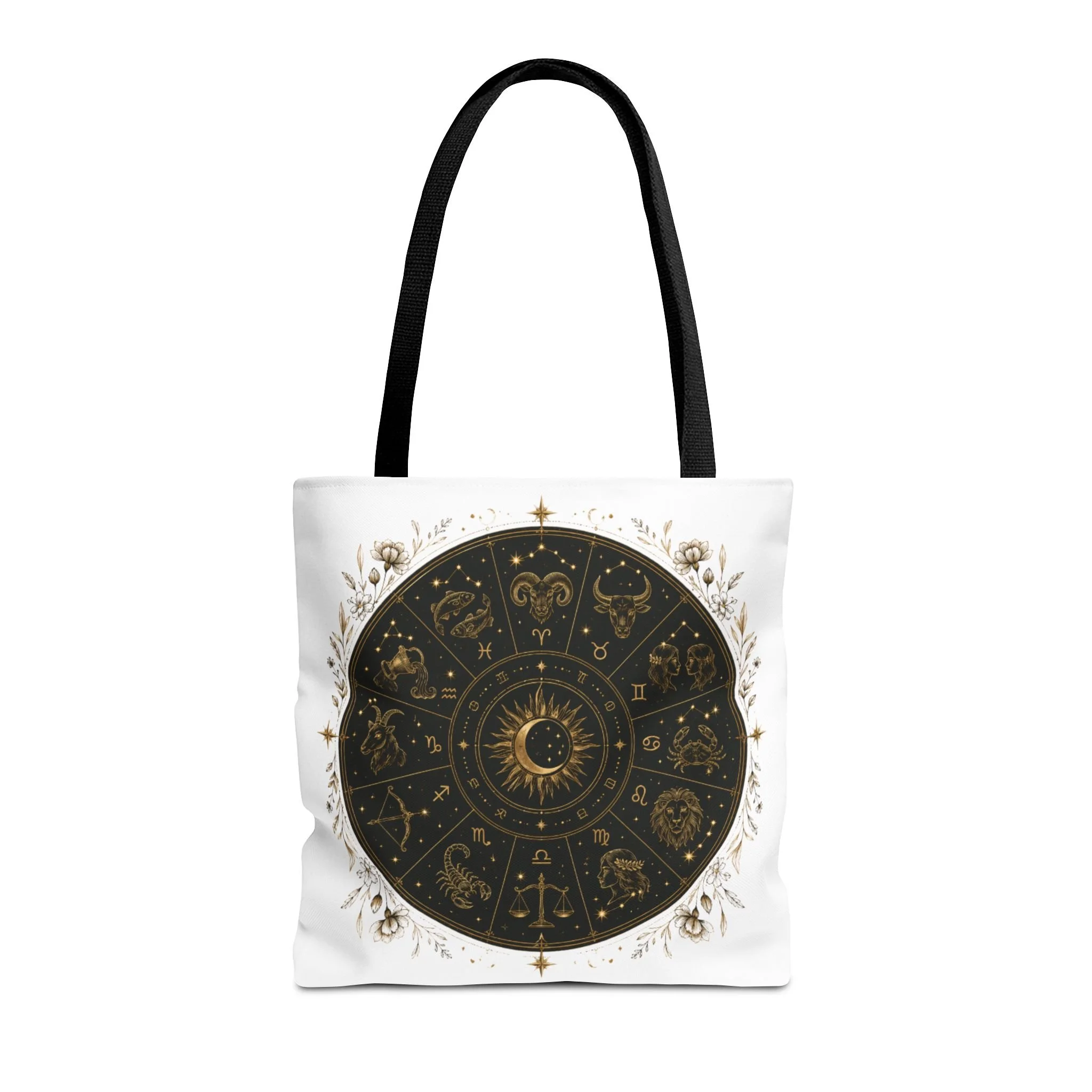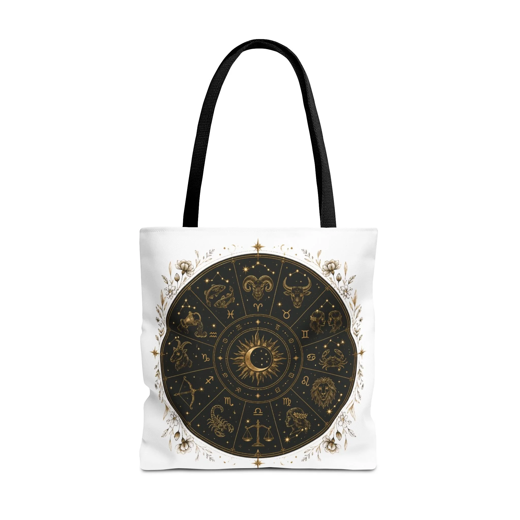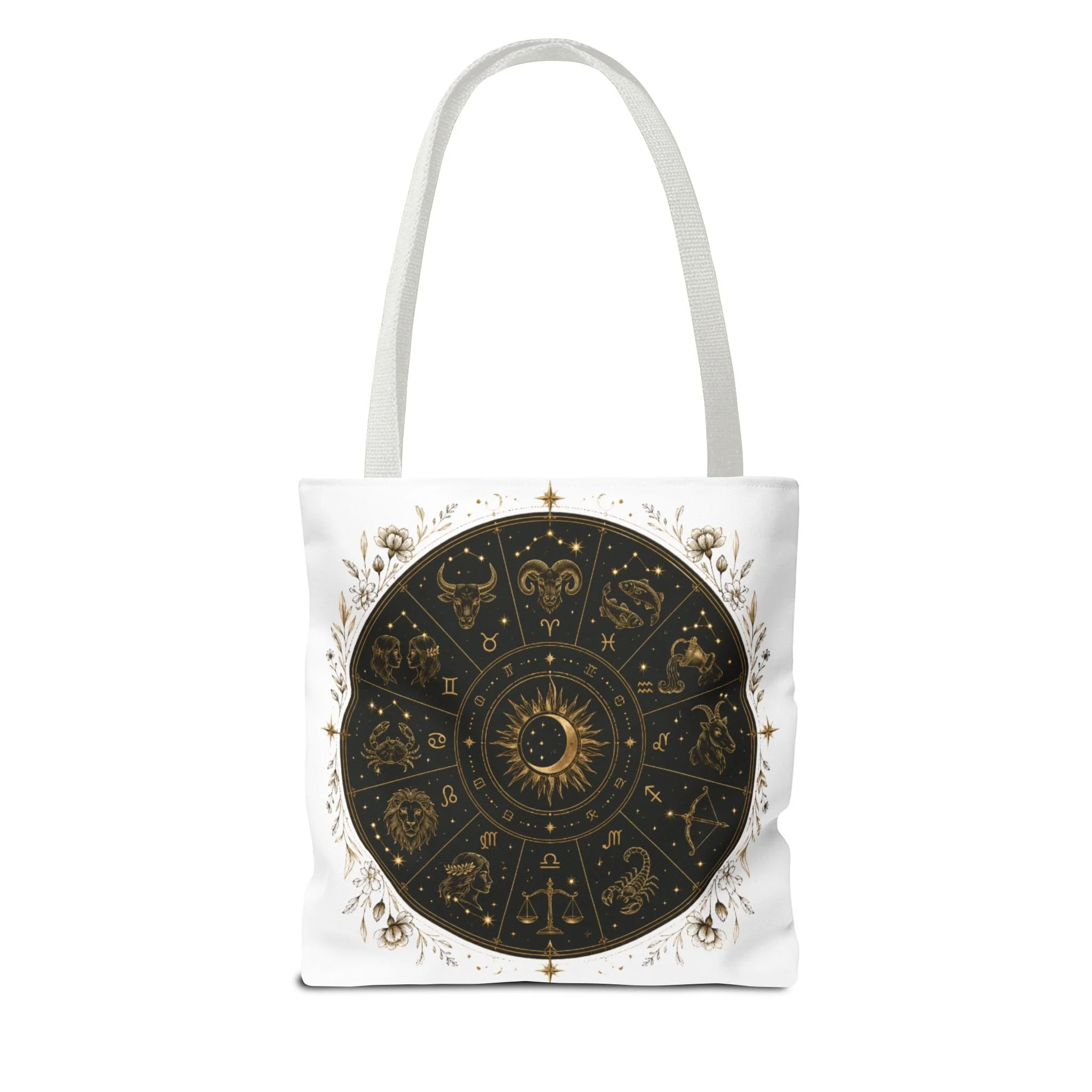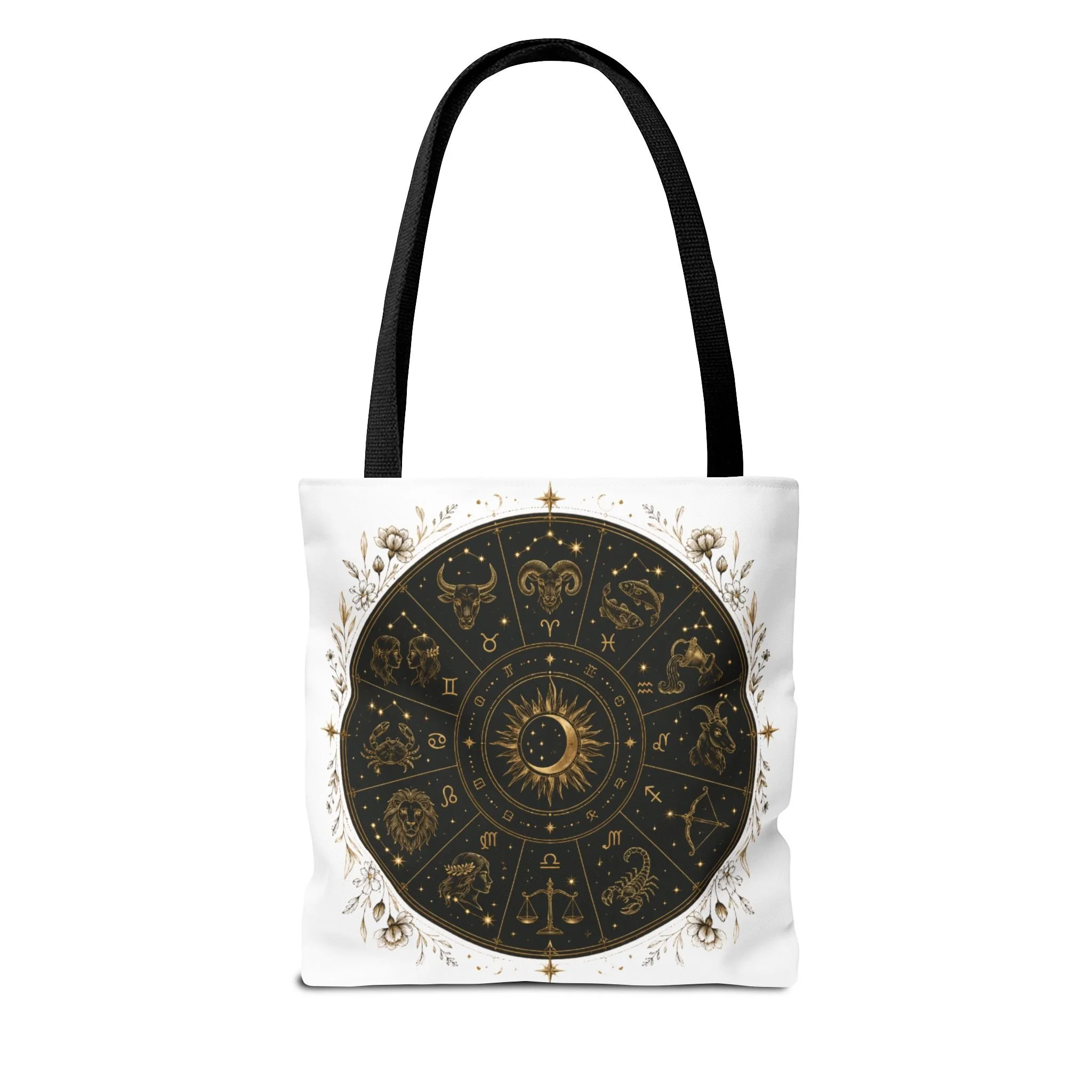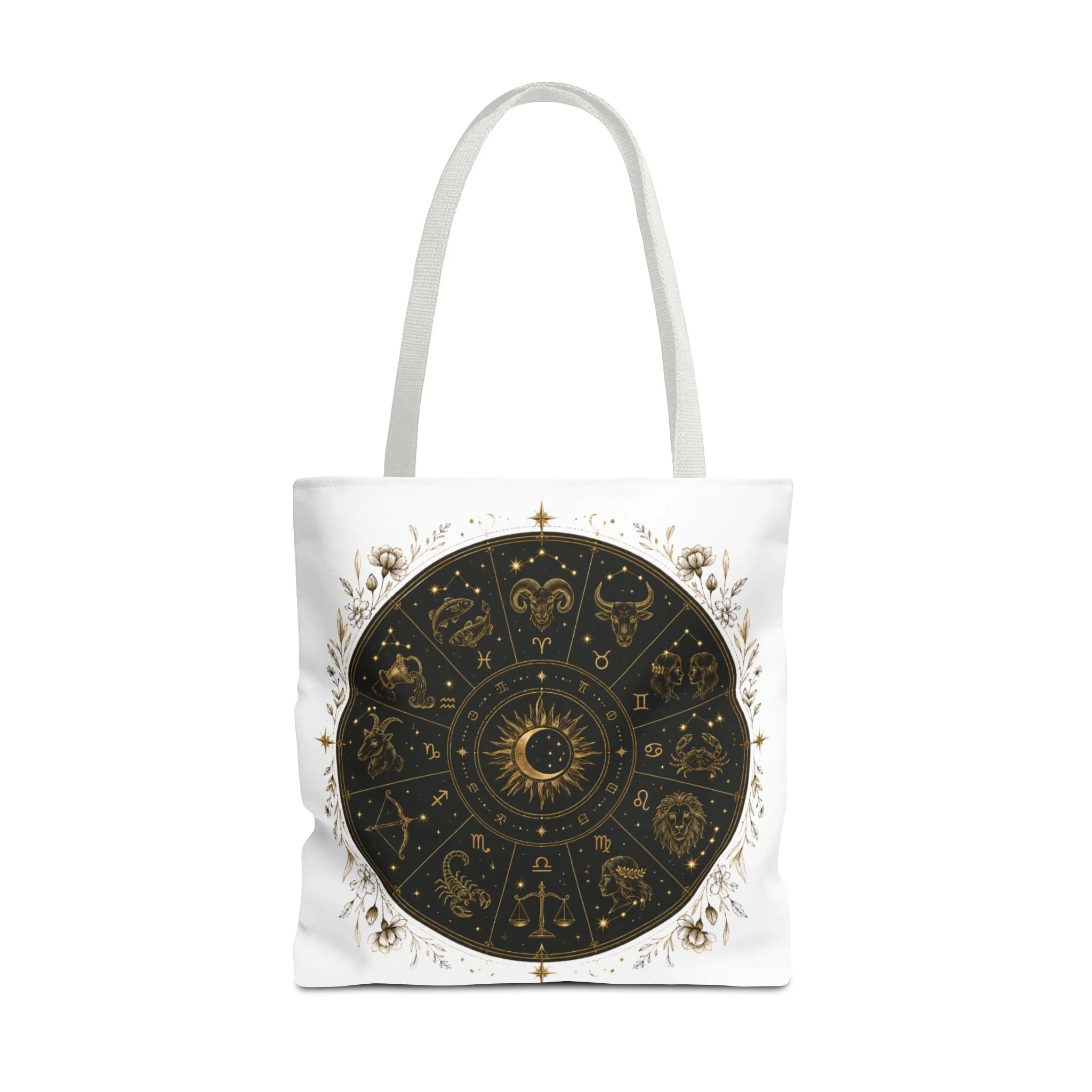 It also makes a thoughtful gift for astrology fans, zodiac lovers, crystal lovers, tarot readers, stargazers, spiritual friends, and cosmic souls. Carry a night sky of symbols with you—this tote blends vintage astrology with modern utility. A deep, circular chart in matte black and antique gold sits centered on clean white fabric, framed by delicate flourishes that feel both old-world and quietly magical. The roomy interior and boxed corners hold groceries, books, ritual tools, or a laptop sleeve, while the reinforced handles and crisp stitching mean it moves through daily life without drama. It’s the kind of tote that becomes part of your routine: for market runs at dawn, sketching sessions in dim cafés, or slow evenings arranging crystals and candles. Subtle, evocative, and built to last.
