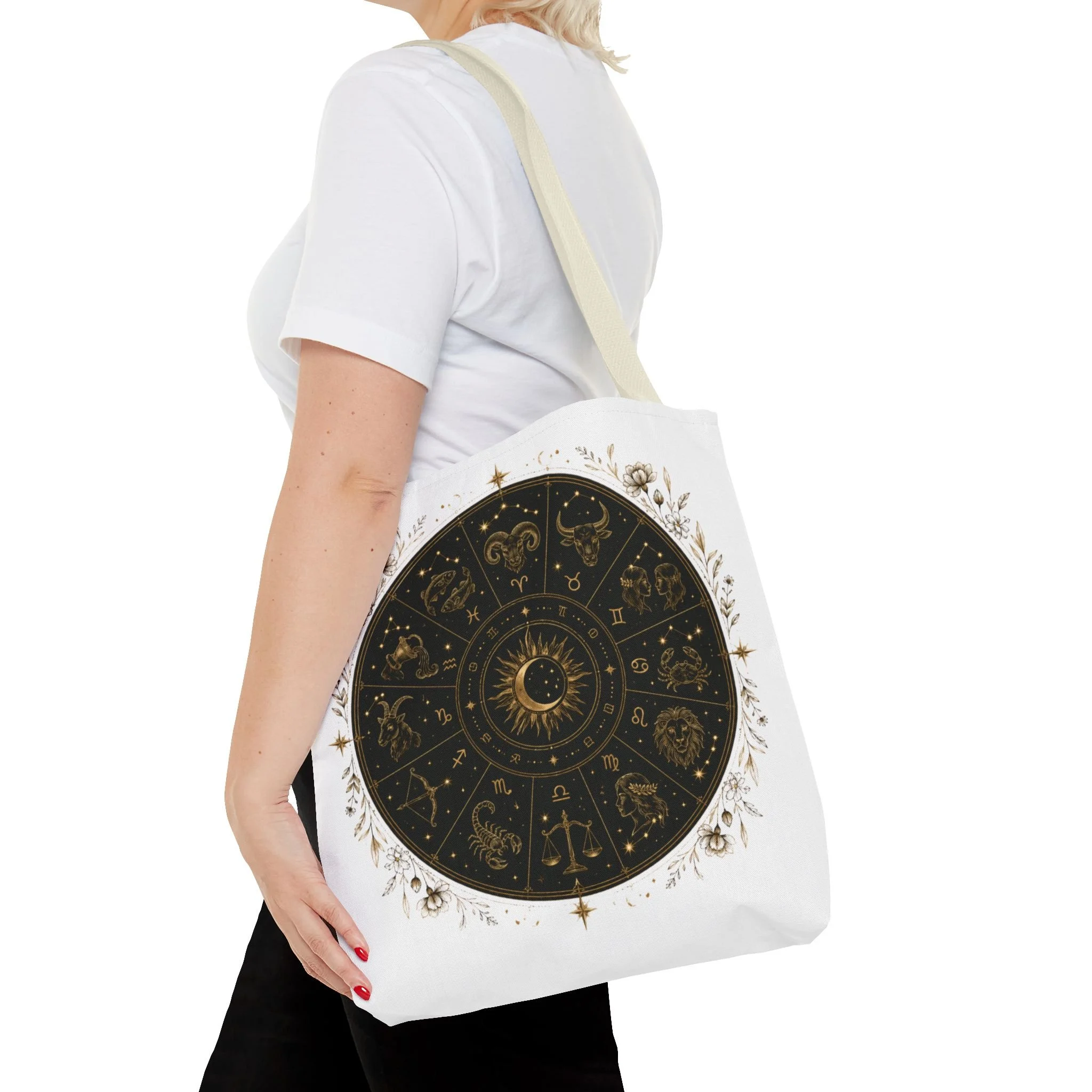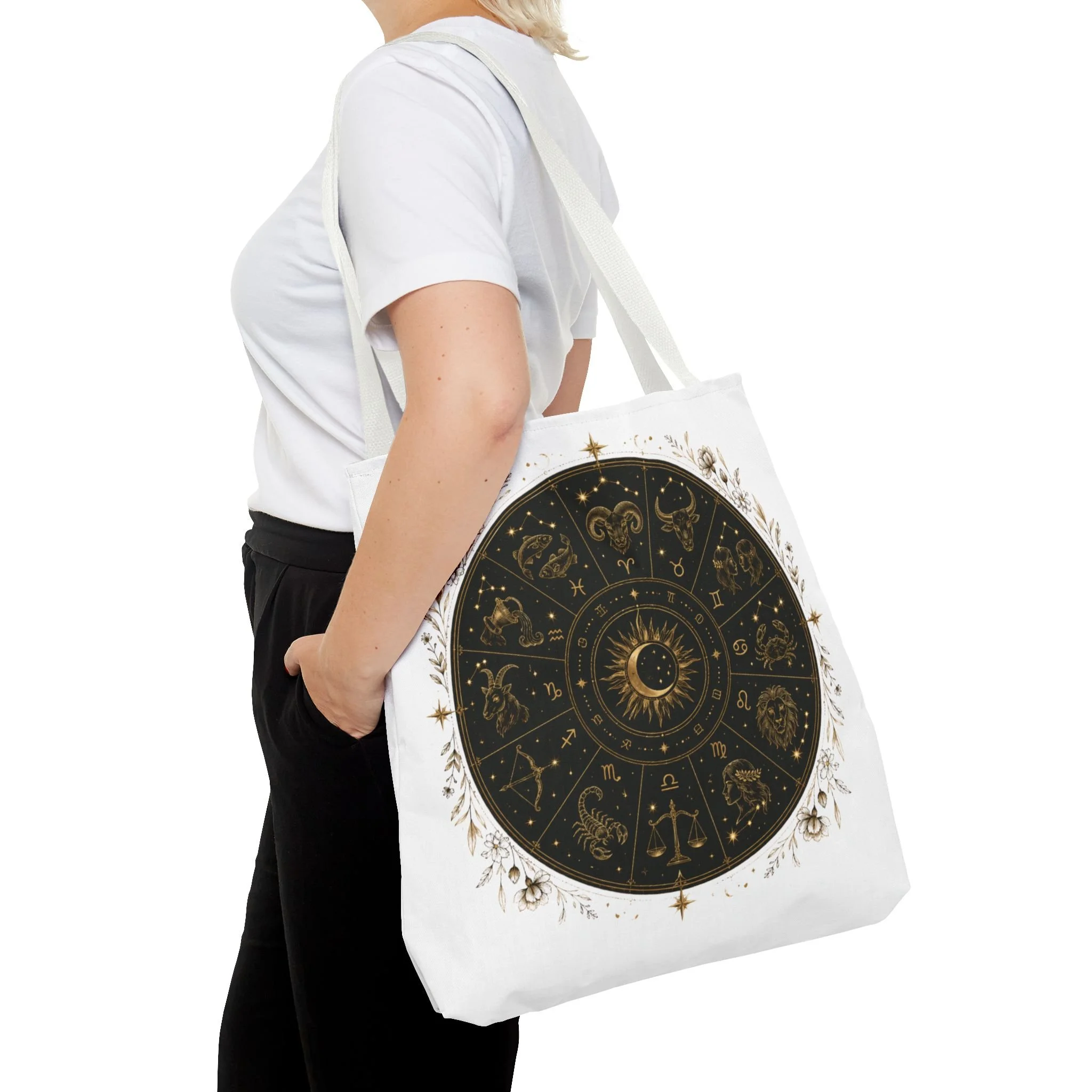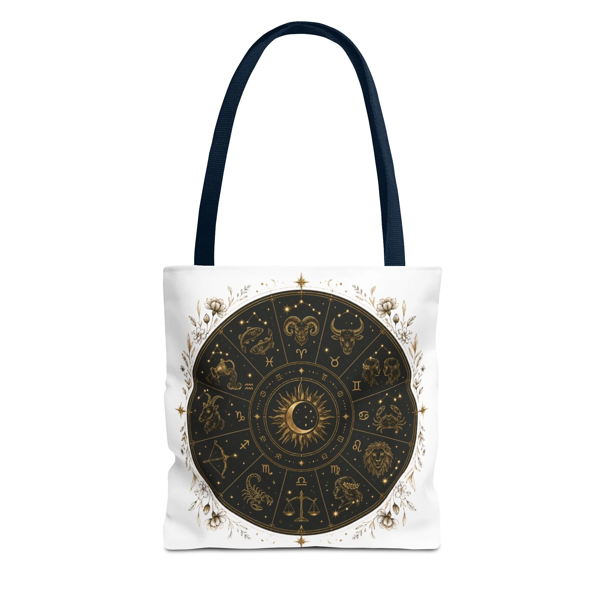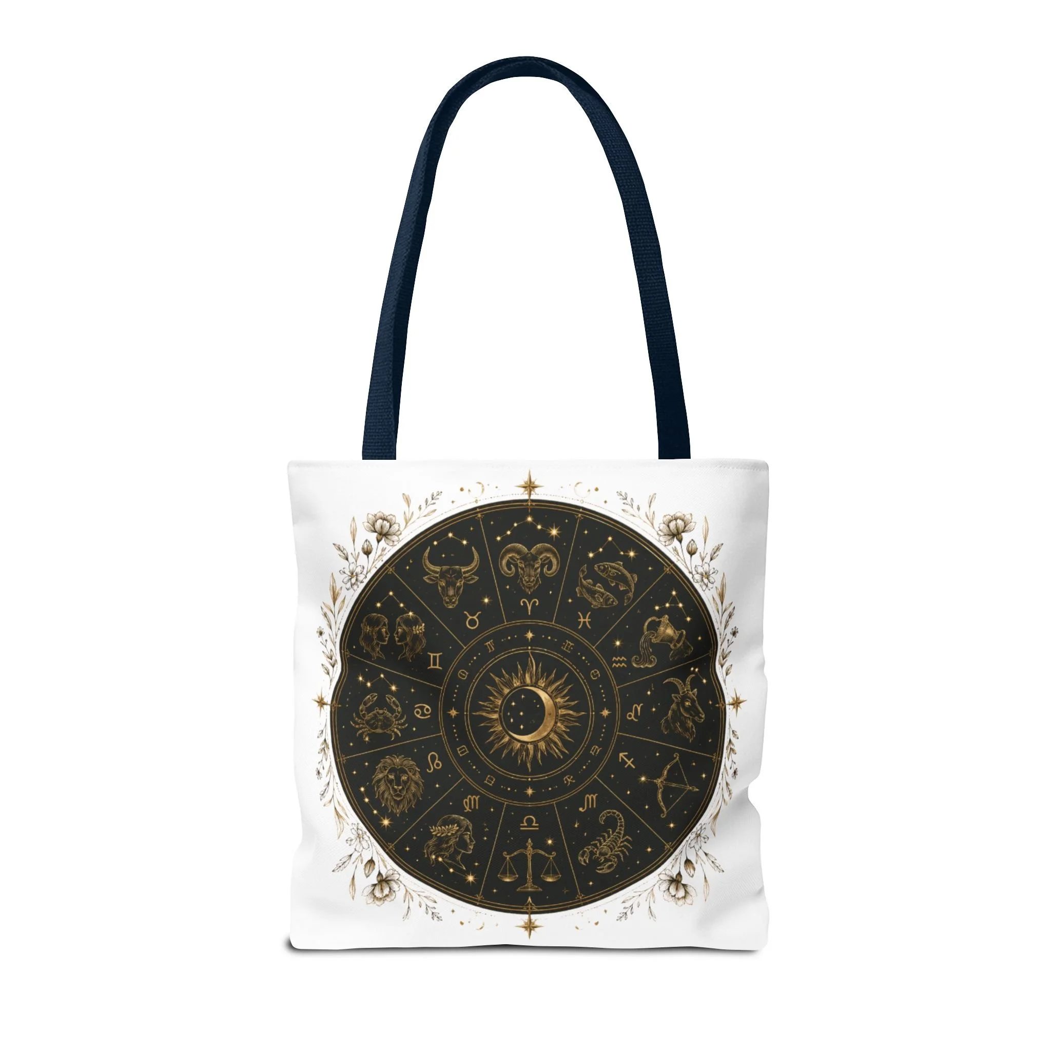 It also makes a thoughtful gift for astrology fans, zodiac lovers, crystal lovers, tarot readers, stargazers, spiritual friends, and cosmic souls. Carry a night sky of symbols with you—this tote blends vintage astrology with modern utility. A deep, circular chart in matte black and antique gold sits centered on clean white fabric, framed by delicate flourishes that feel both old-world and quietly magical. The roomy interior and boxed corners hold groceries, books, ritual tools, or a laptop sleeve, while the reinforced handles and crisp stitching mean it moves through daily life without drama. It’s the kind of tote that becomes part of your routine: for market runs at dawn, sketching sessions in dim cafés, or slow evenings arranging crystals and candles. Subtle, evocative, and built to last.