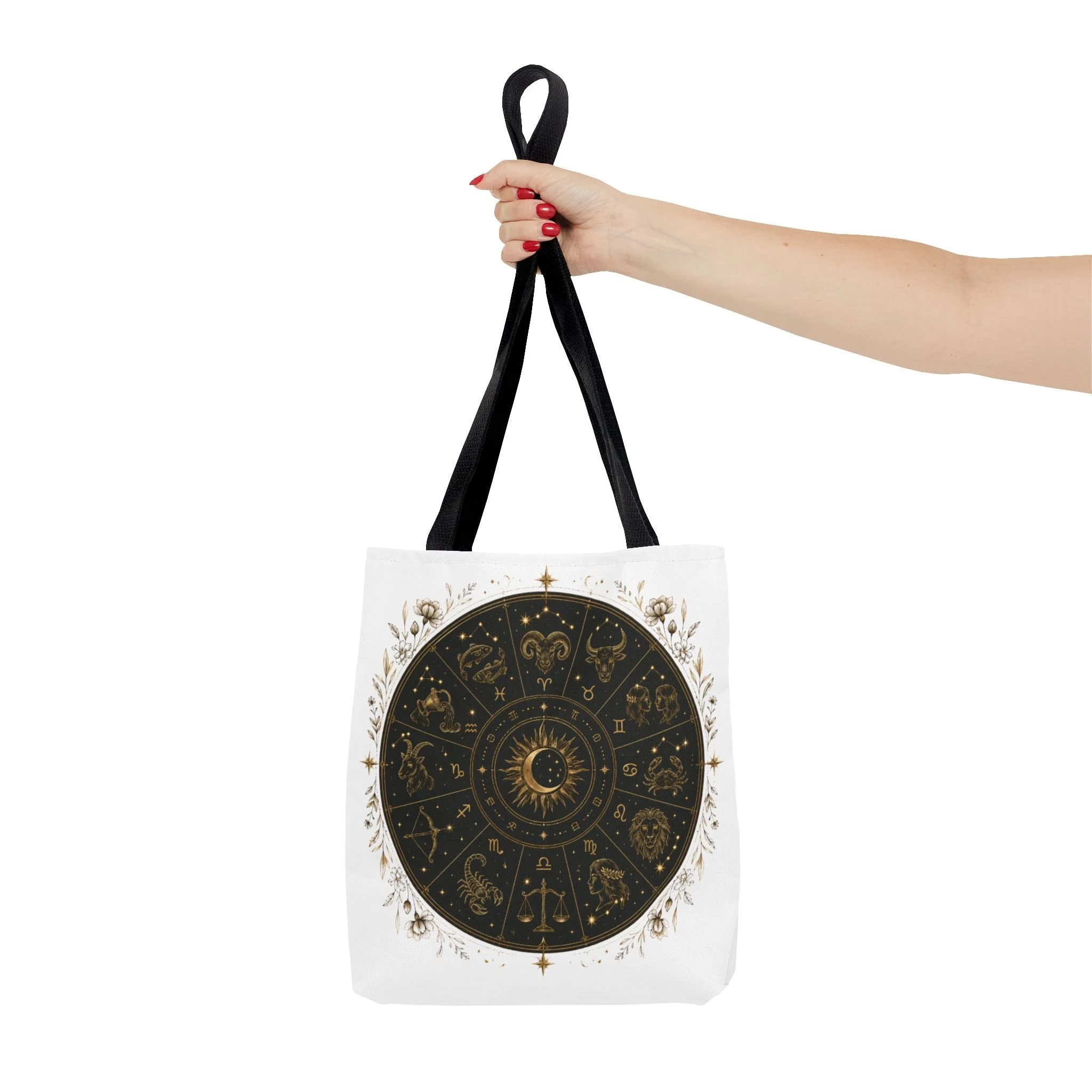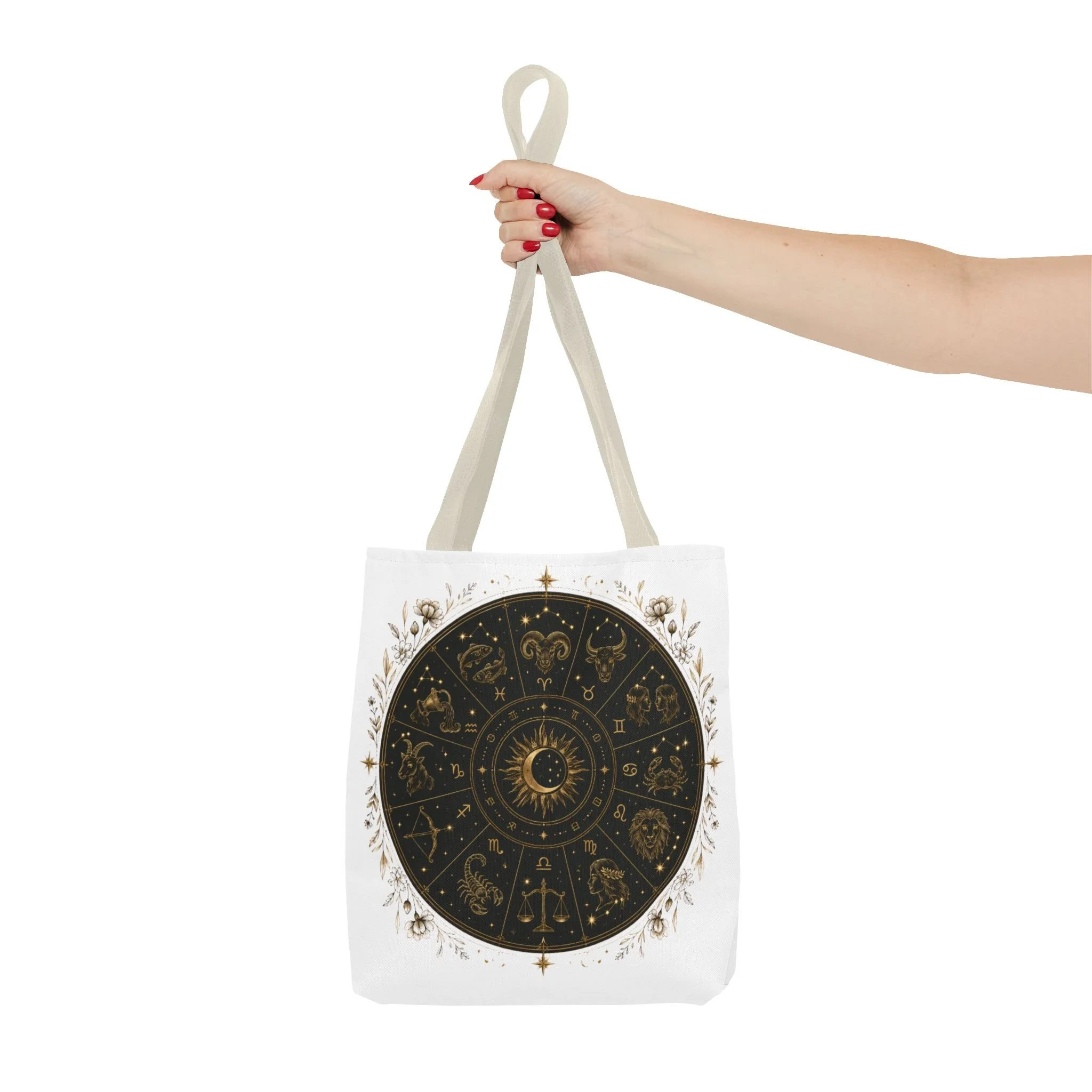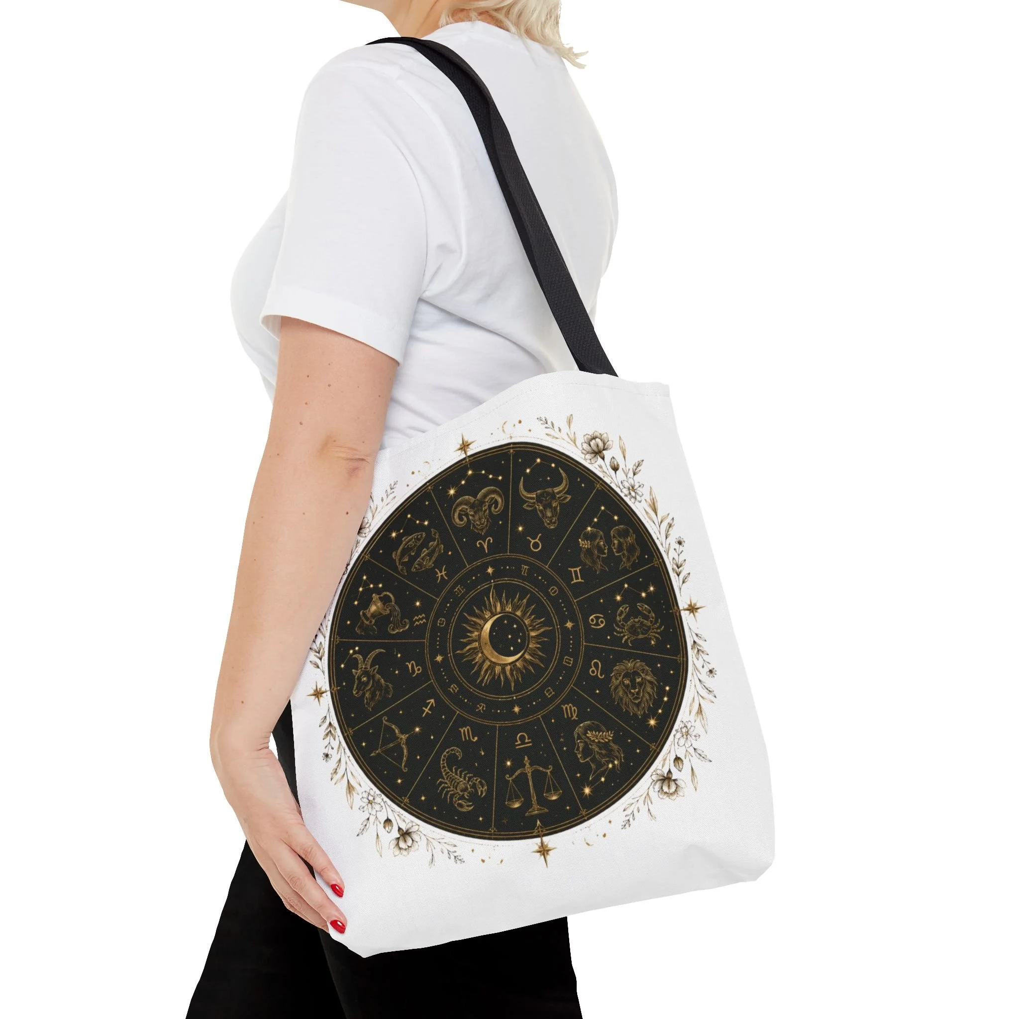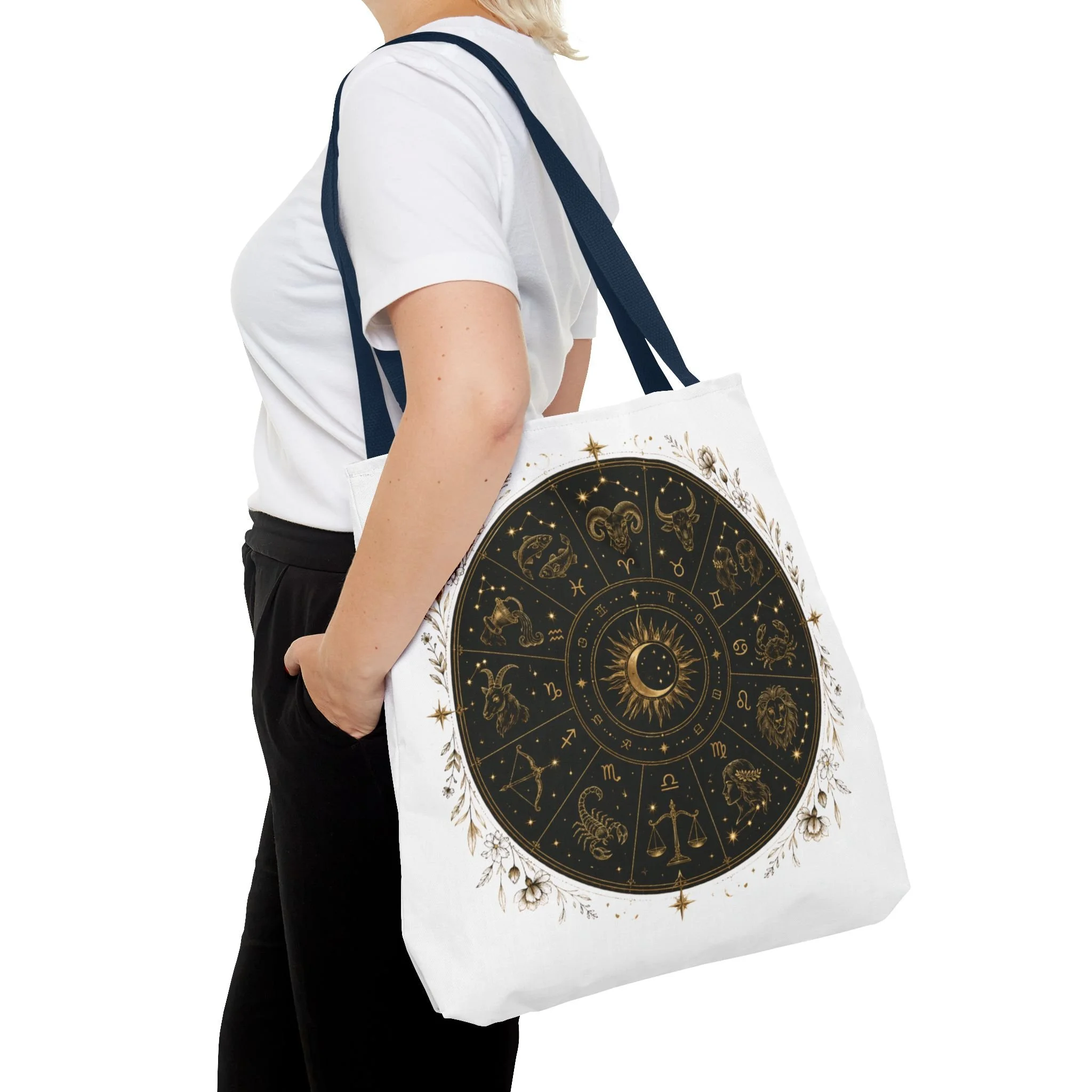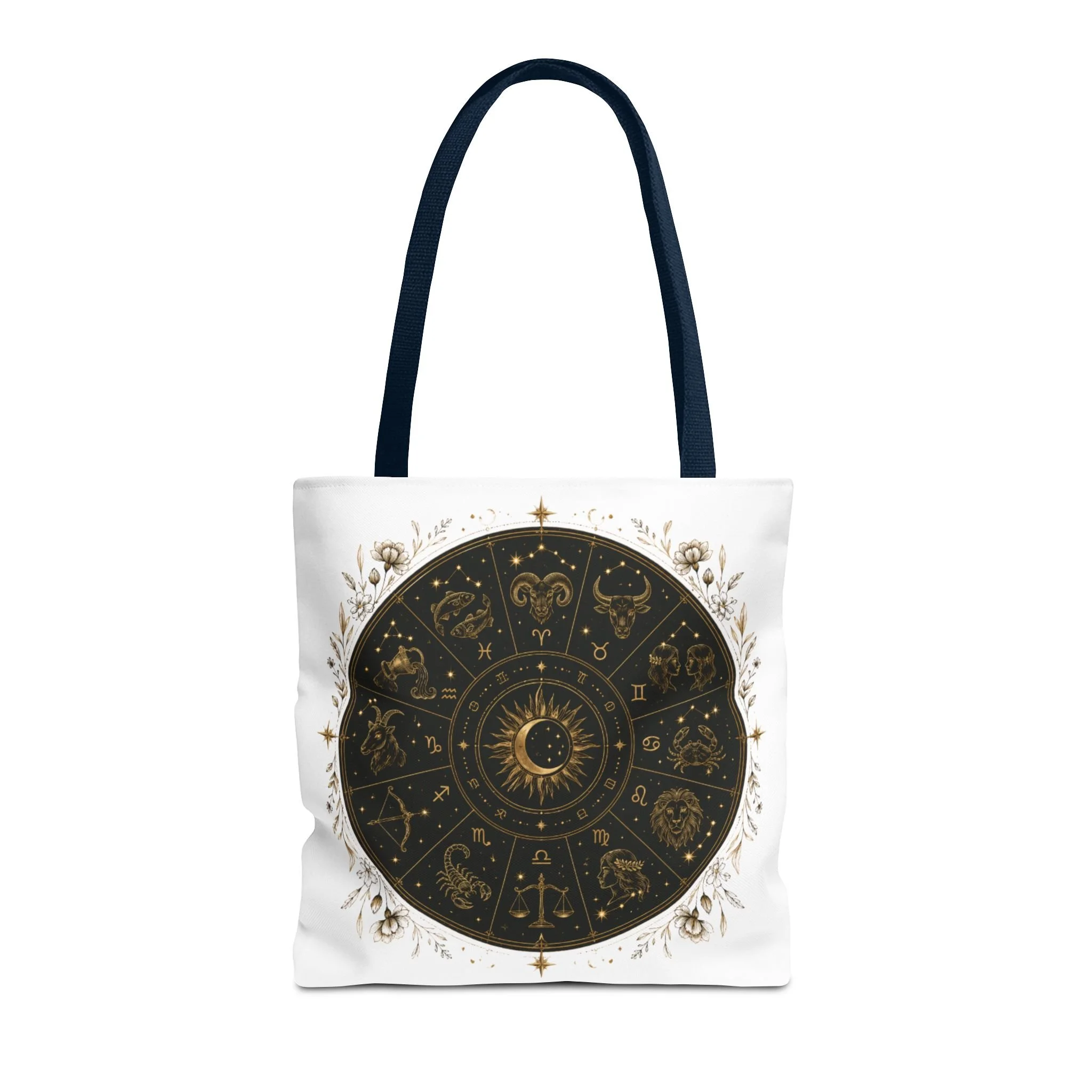 It also makes a thoughtful gift for astrology fans, zodiac lovers, crystal lovers, tarot readers, stargazers, spiritual friends, and cosmic souls. Carry a night sky of symbols with you—this tote blends vintage astrology with modern utility. A deep, circular chart in matte black and antique gold sits centered on clean white fabric, framed by delicate flourishes that feel both old-world and quietly magical. The roomy interior and boxed corners hold groceries, books, ritual tools, or a laptop sleeve, while the reinforced handles and crisp stitching mean it moves through daily life without drama. It’s the kind of tote that becomes part of your routine: for market runs at dawn, sketching sessions in dim cafés, or slow evenings arranging crystals and candles. Subtle, evocative, and built to last.